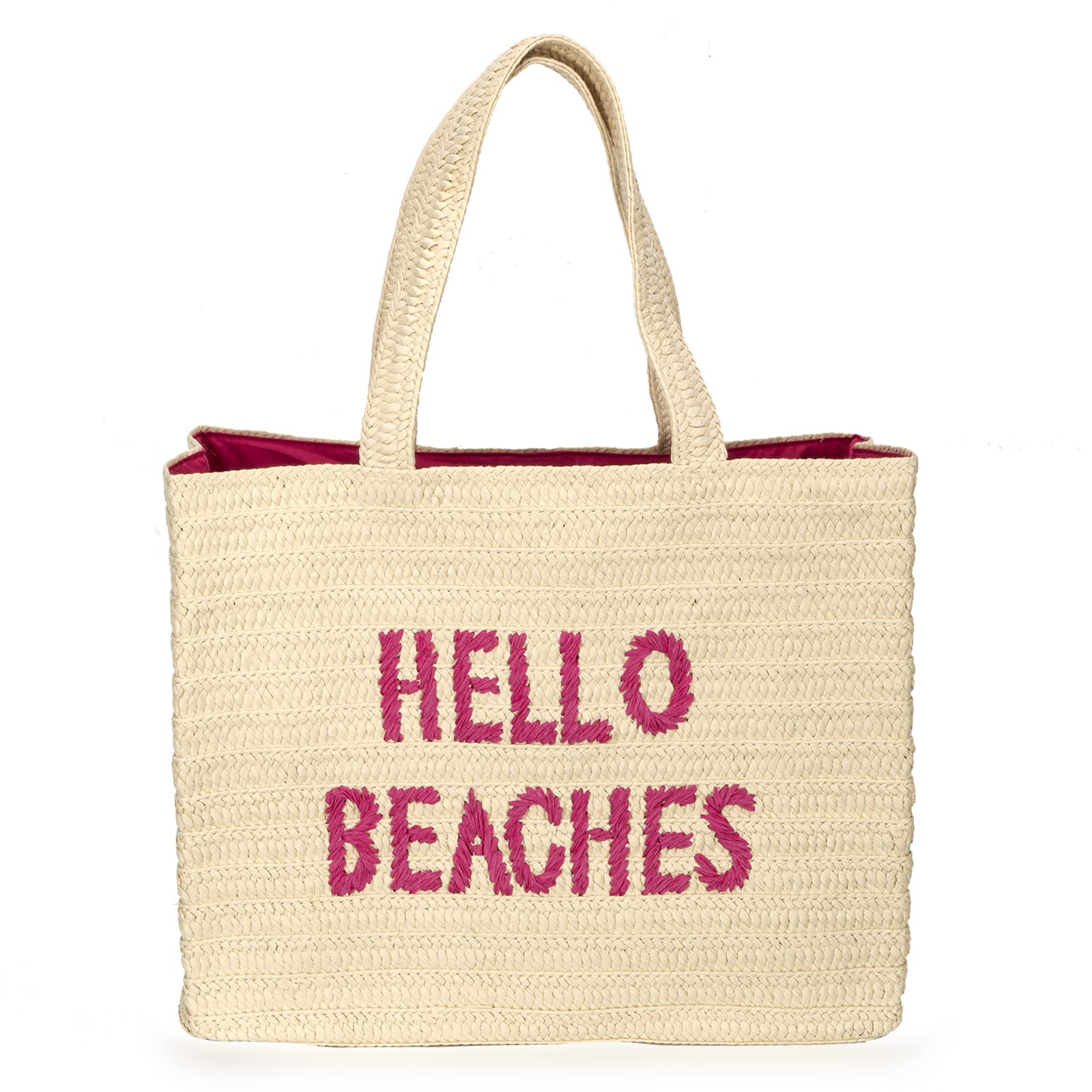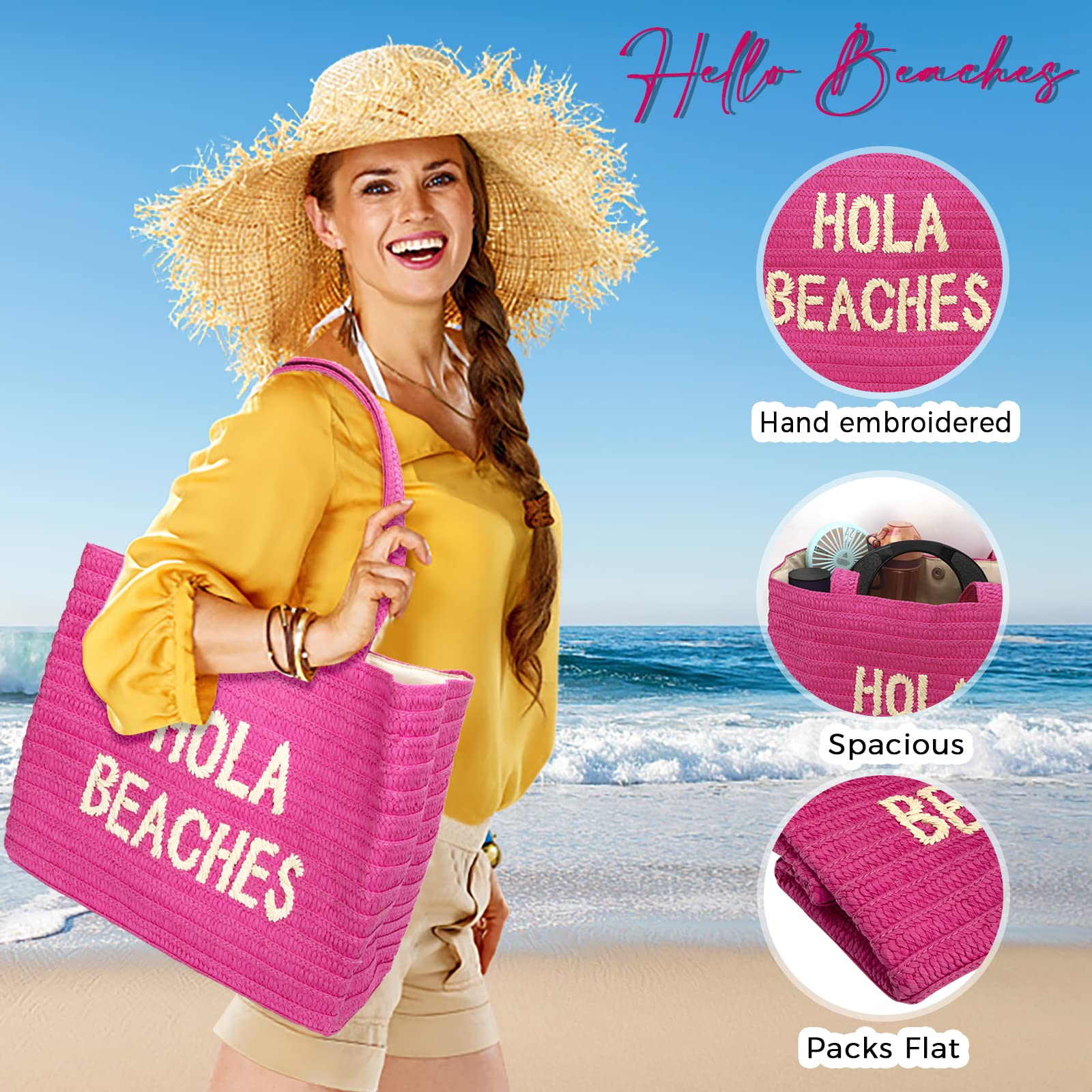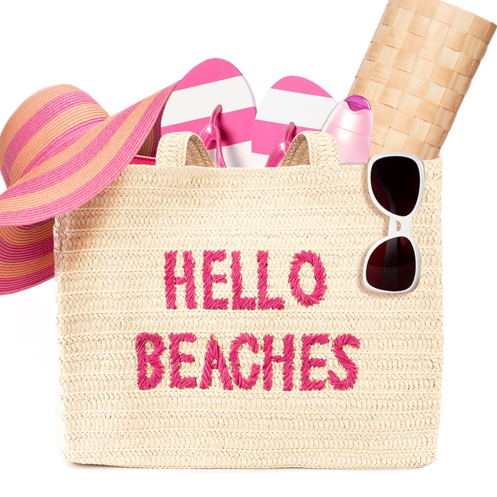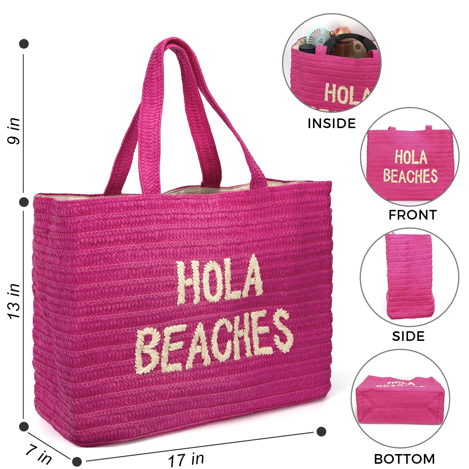 - Introducing the ultimate beach tote bag! Our Hola Beaches straw beach bag is a must-have for every beachgoer. Rope embroidered by skilled artisans, each tote is uniquely crafted. The rectangle base adds an elegant touch to this cute beach bag, which is made of straw and is a packable beach bag because it packs flat. A delicate woven beach bag!