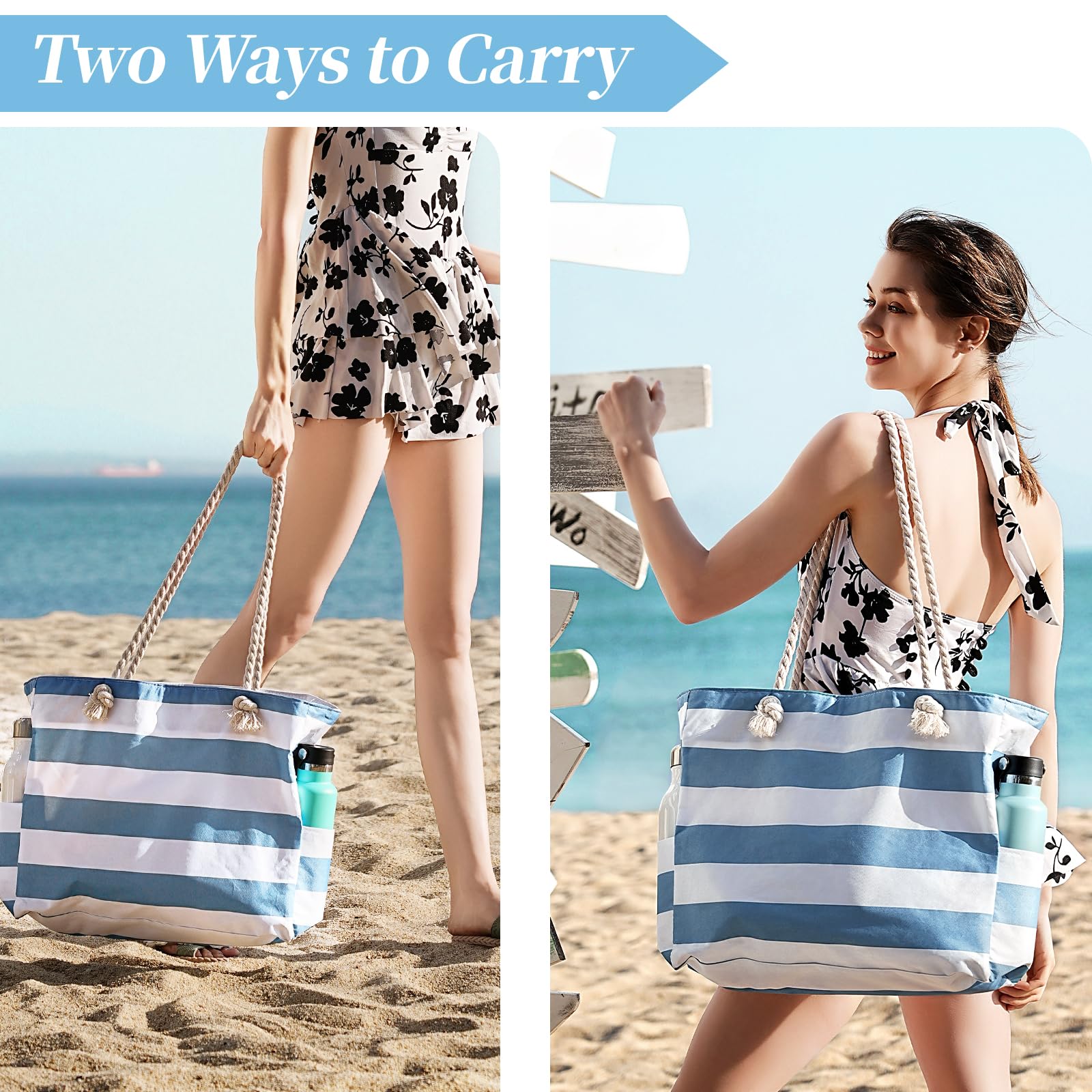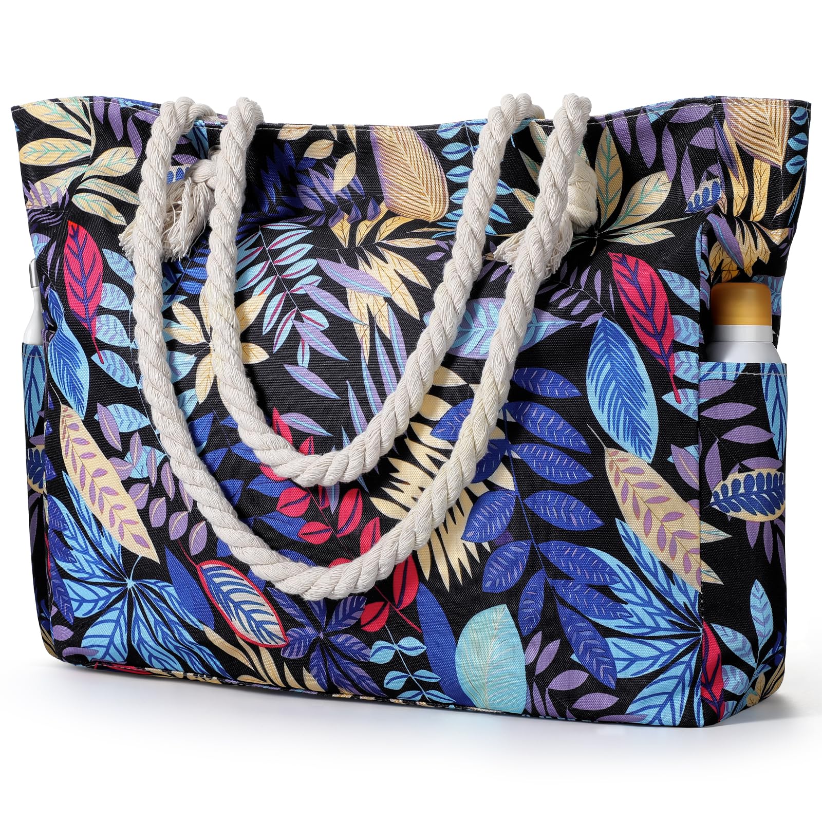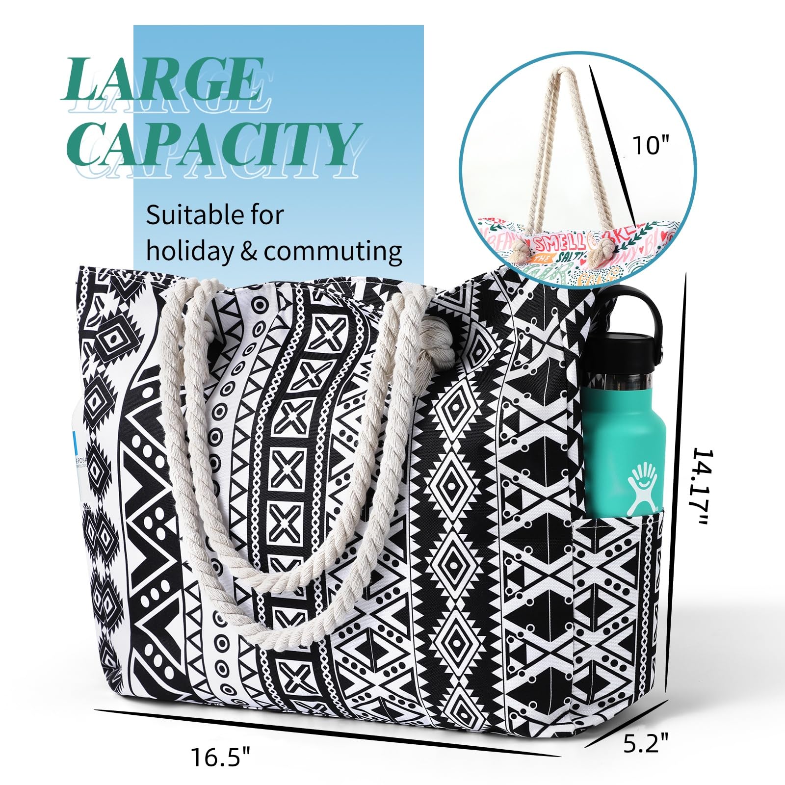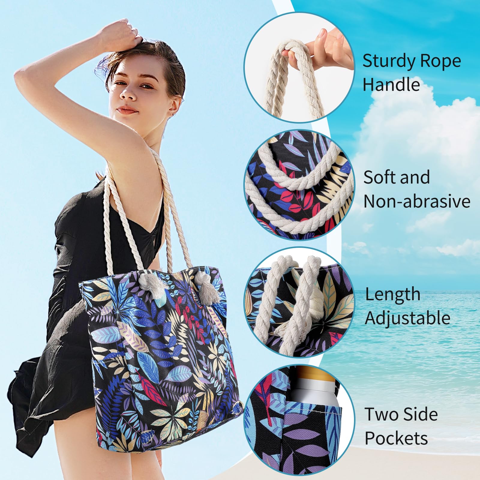 - Sturdy & comfy rope handles with knots sewn under the inner lining to avoid any zip hurdles, make the beach tote a great over the shoulder handbag for women. It is an indispensable item for vacation.