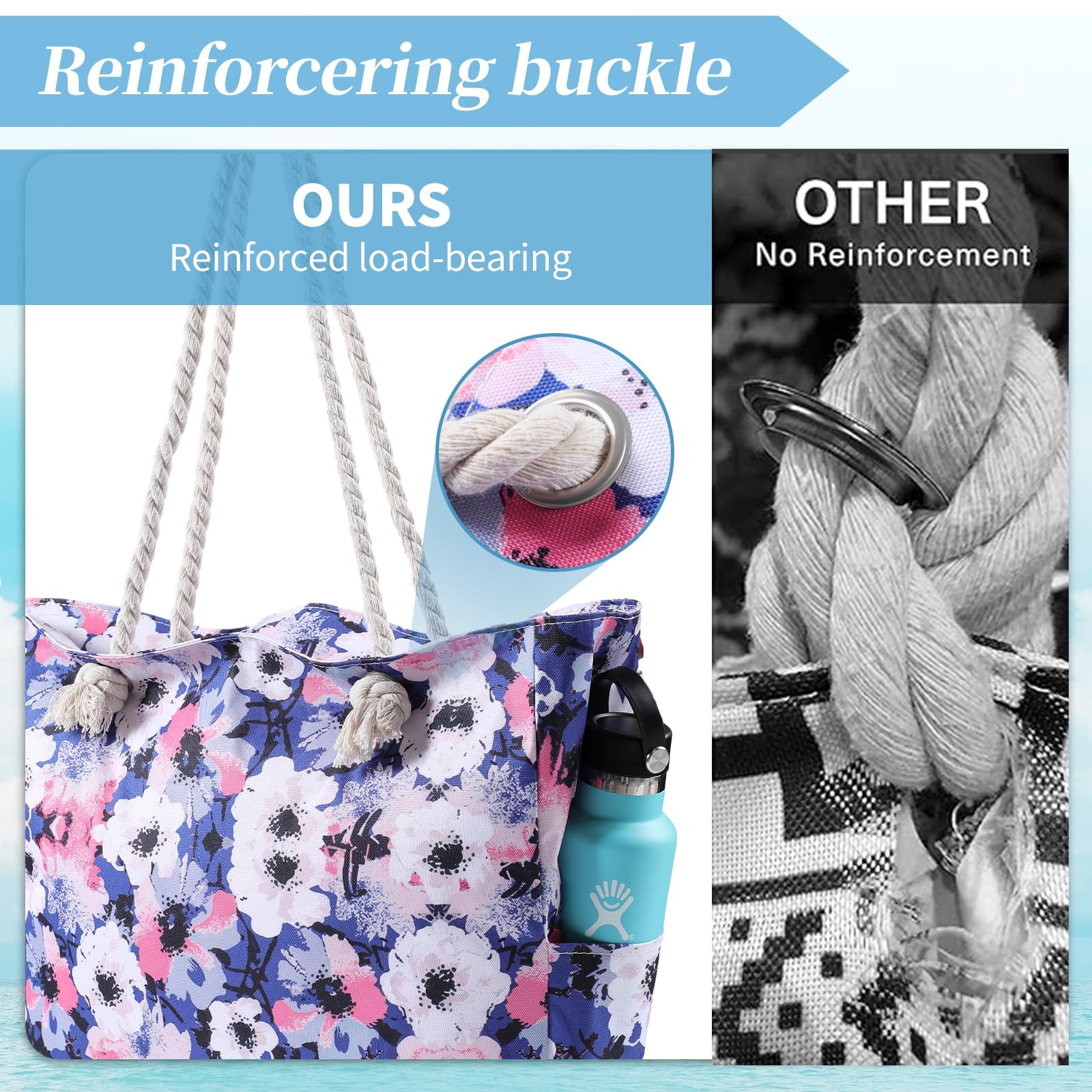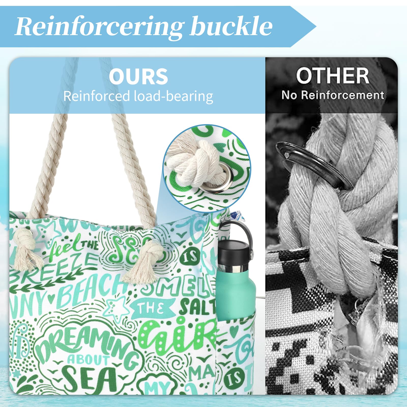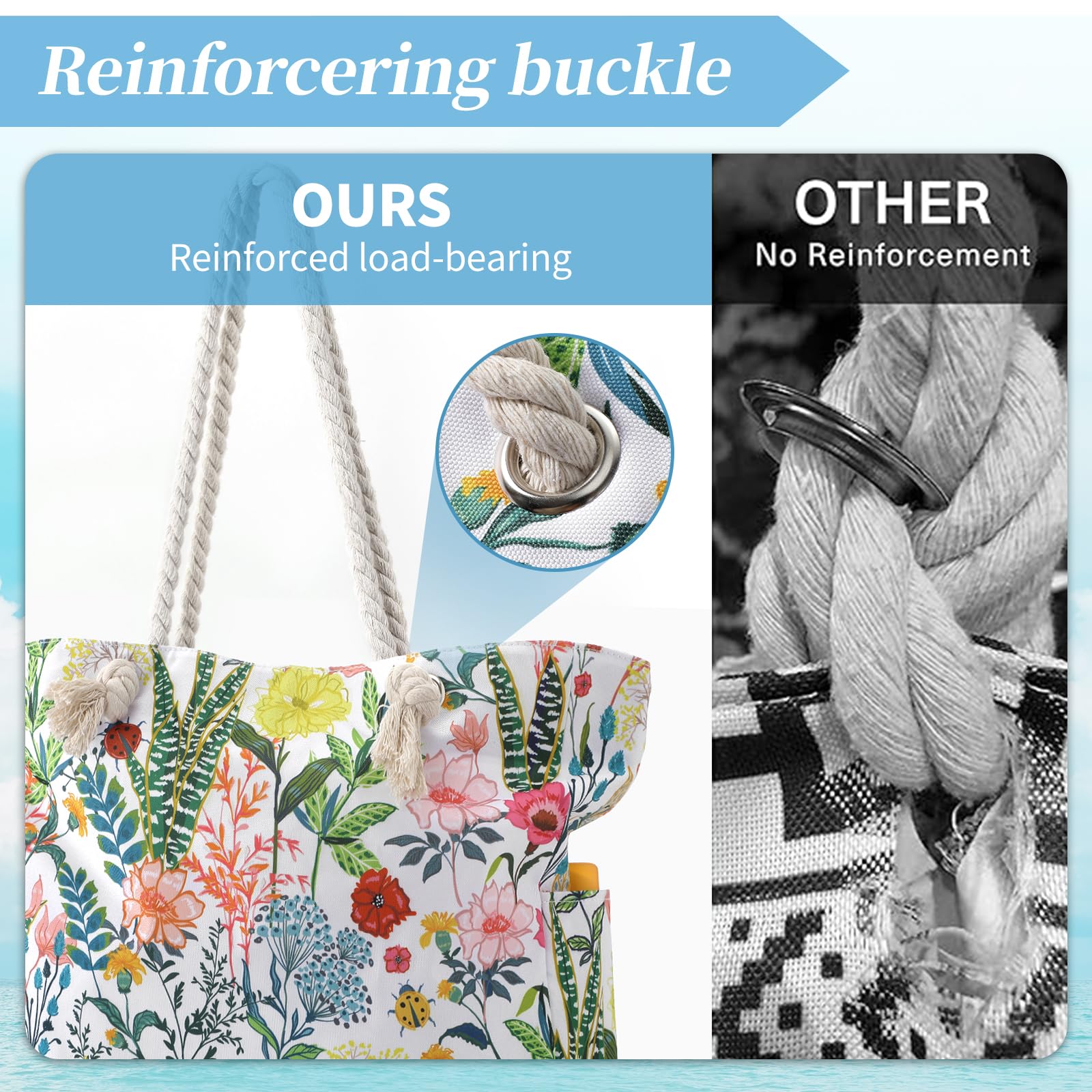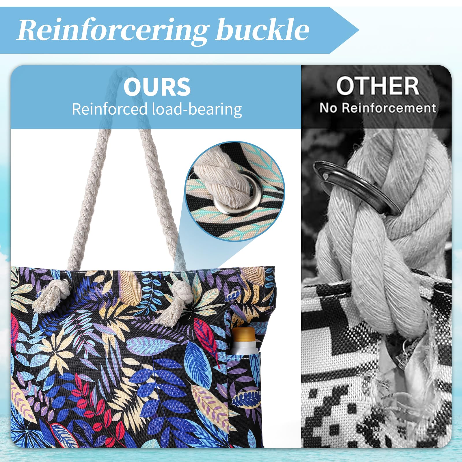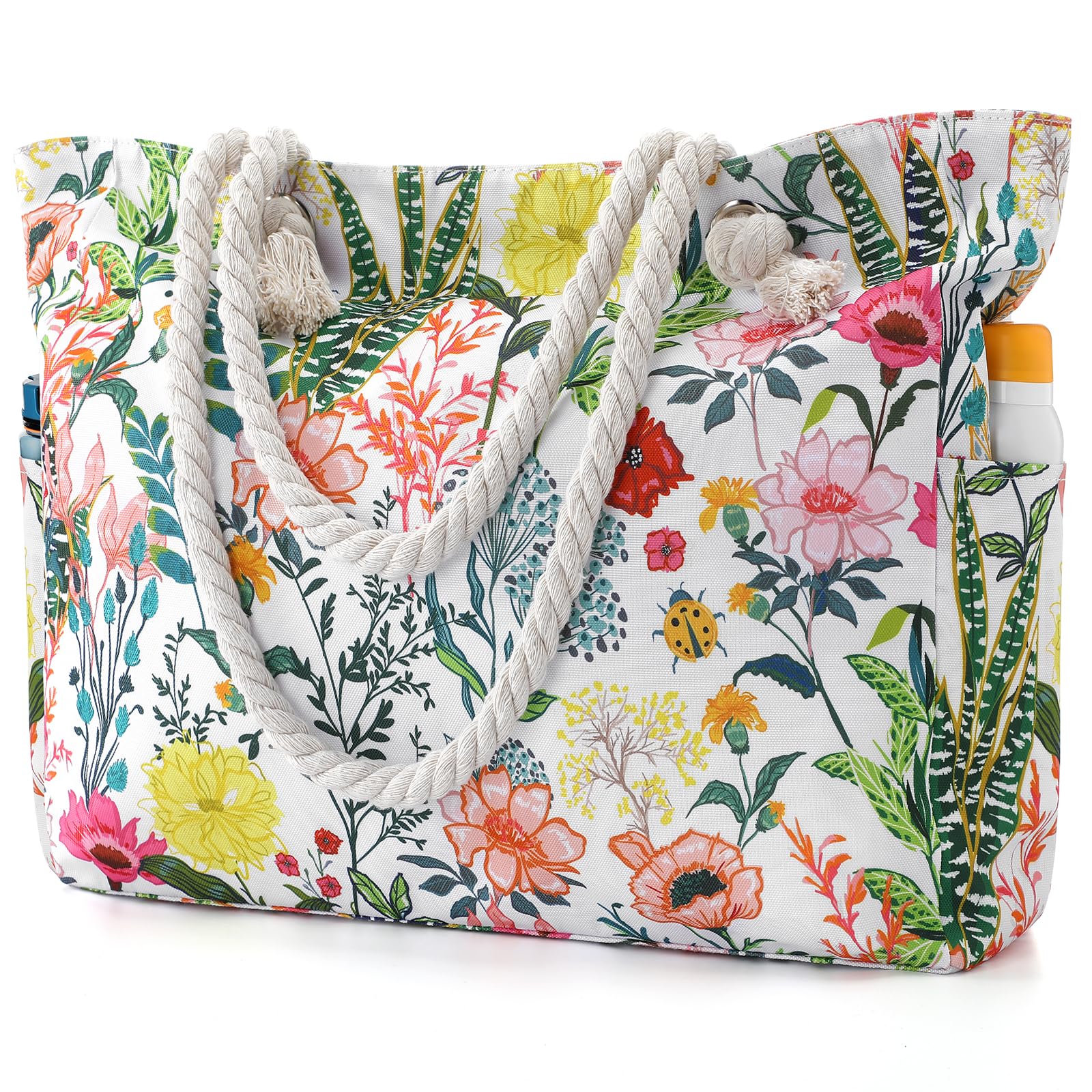 - Sturdy & comfy rope handles with knots sewn under the inner lining to avoid any zip hurdles, make the beach tote a great over the shoulder handbag for women. It is an indispensable item for vacation.