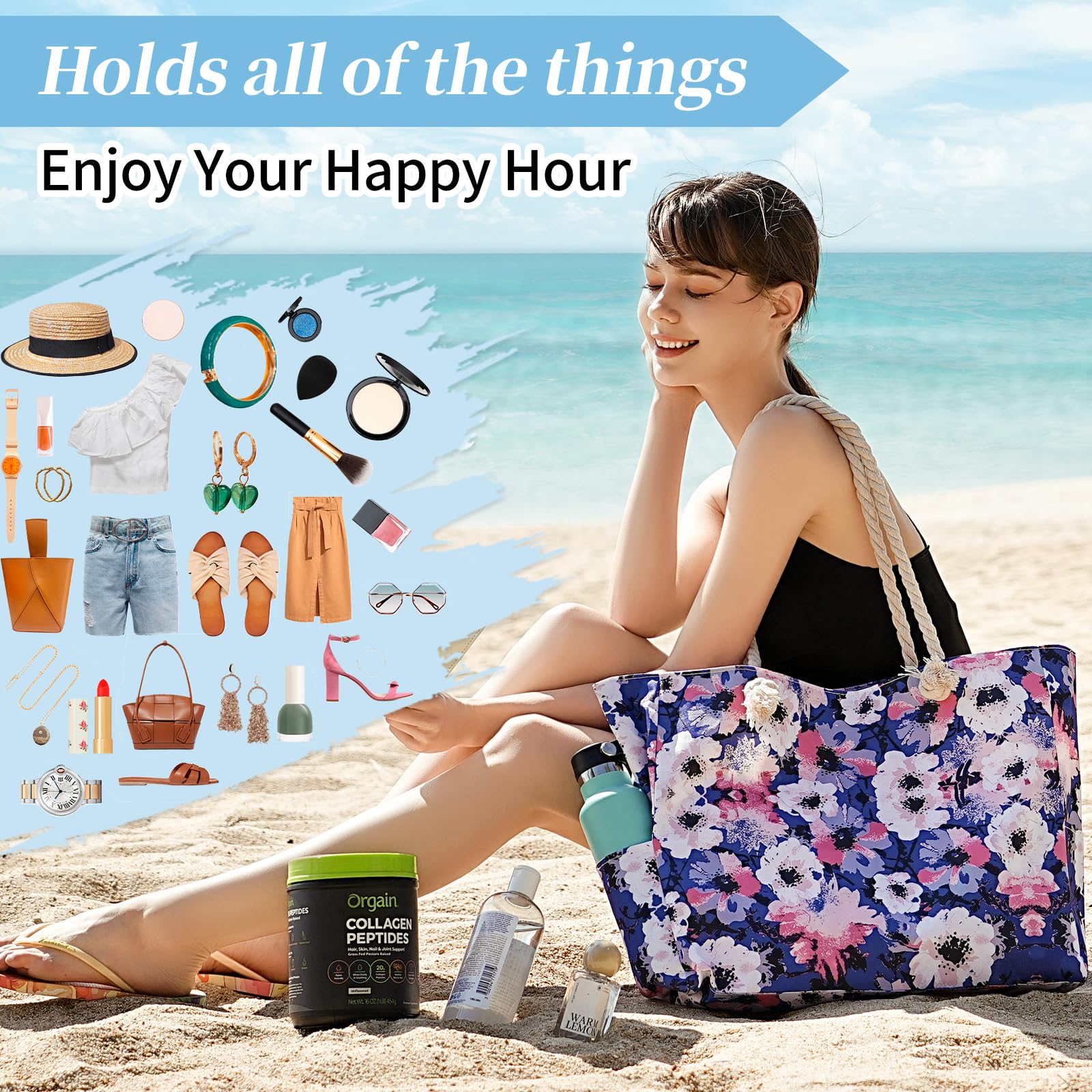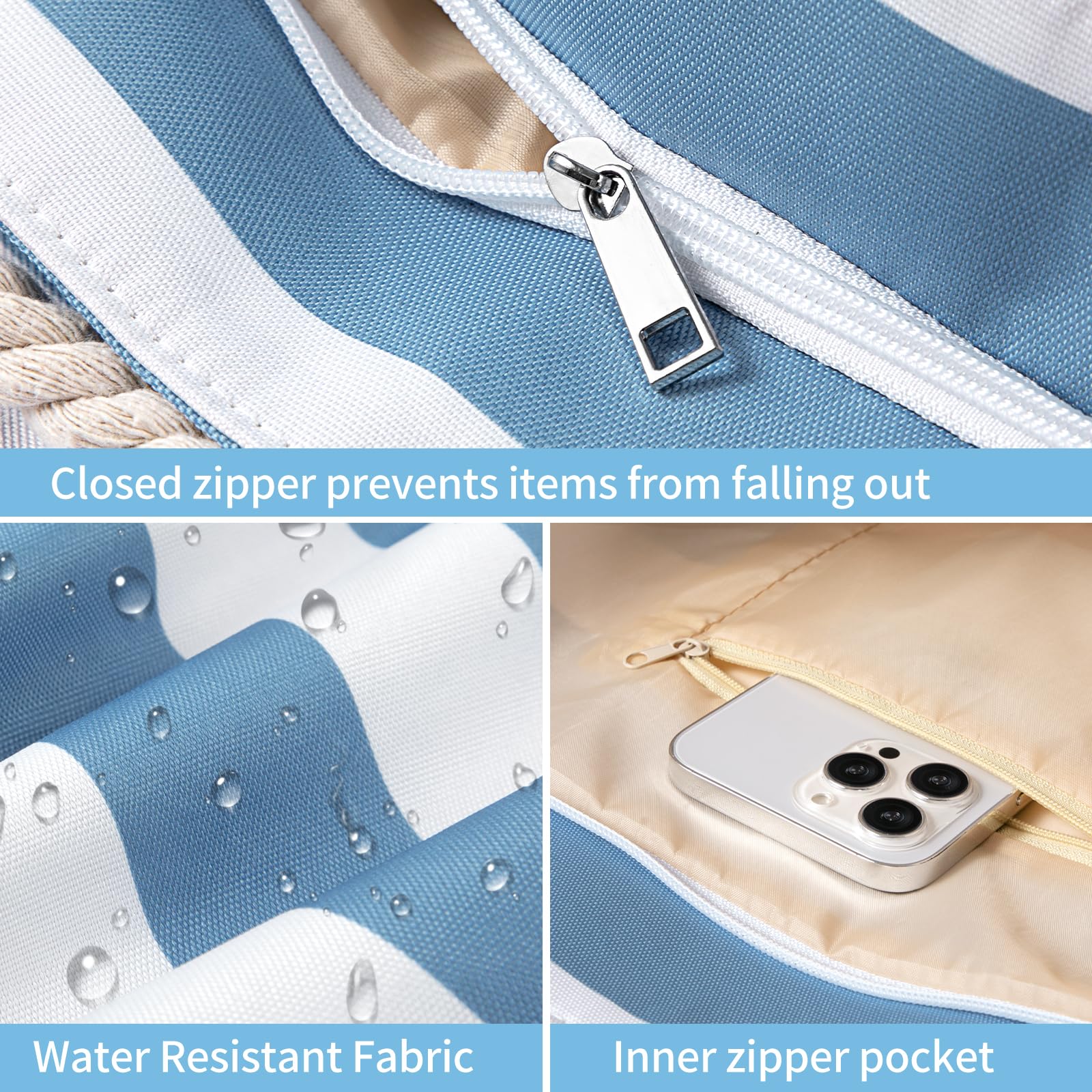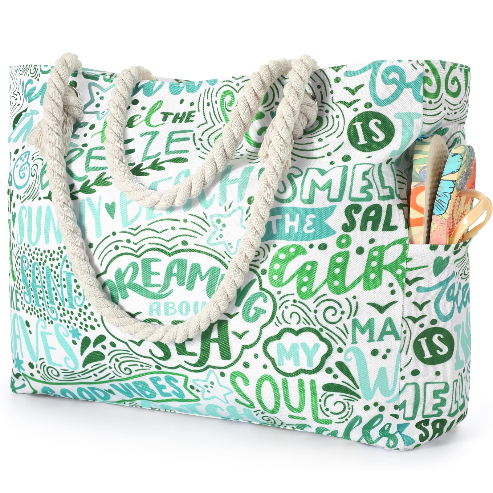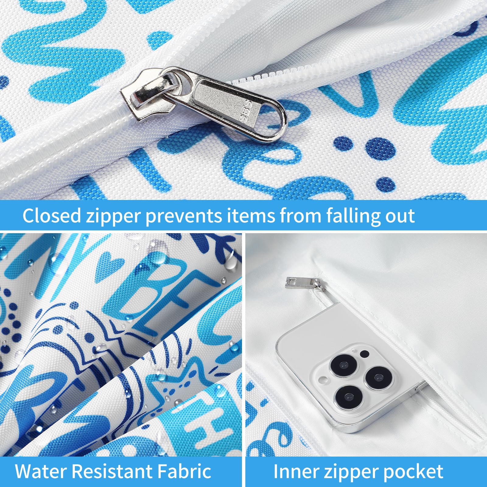 - The beach bag can securely store all your stuff, like lotions, lipstick, beach towel, beach hat, beach toys, coke, wallet, flip flops, sunglasses, sunscreen, swimsuit and other necessities.