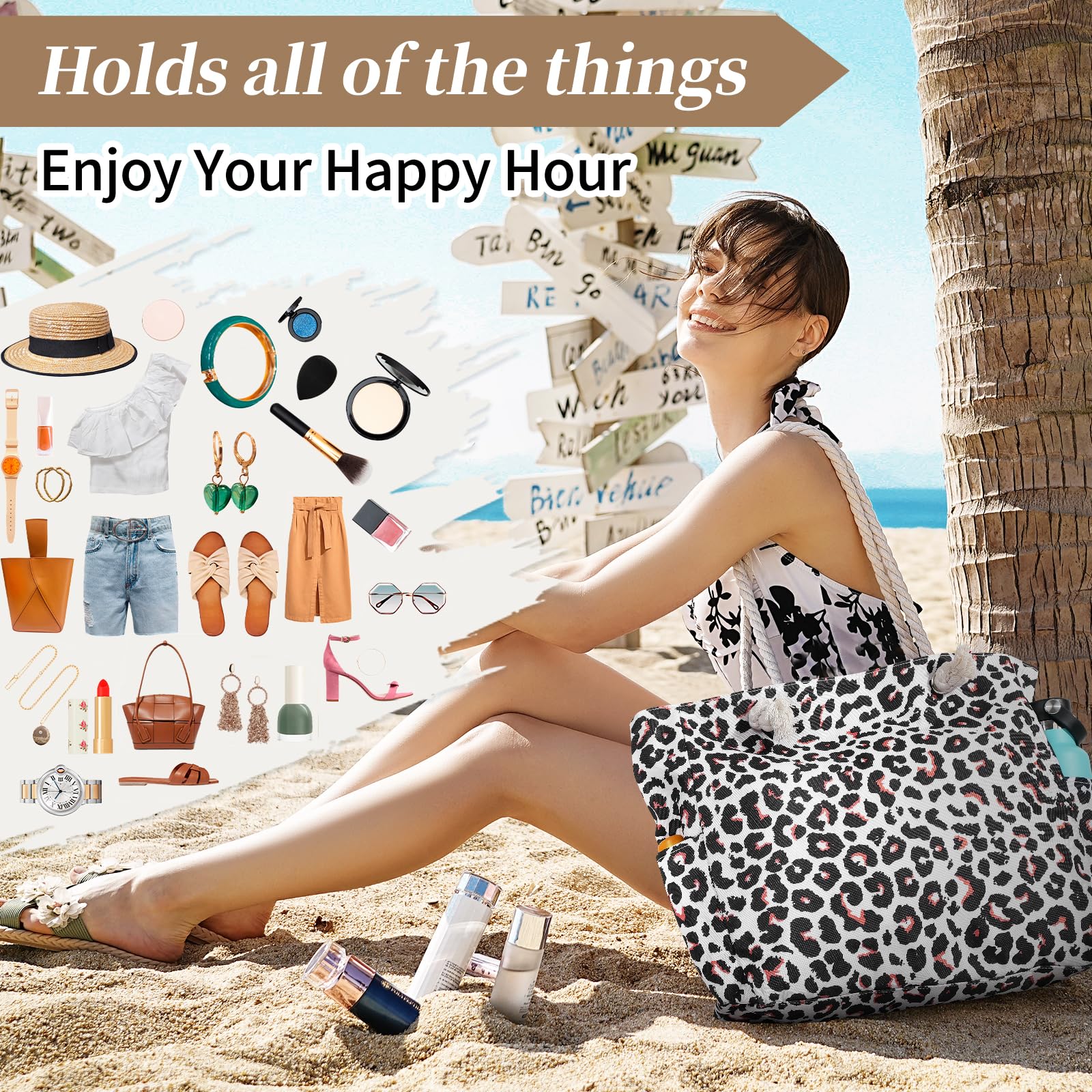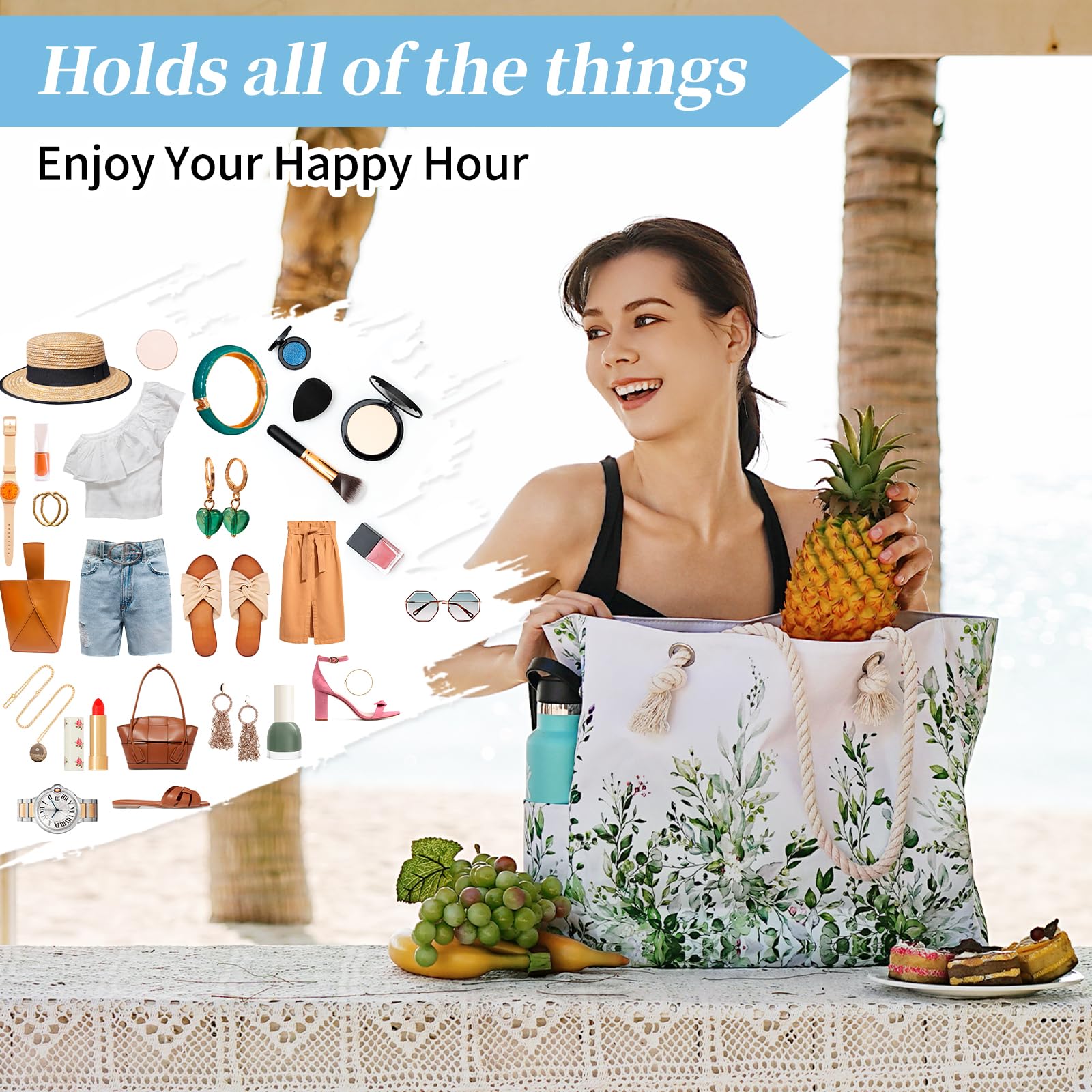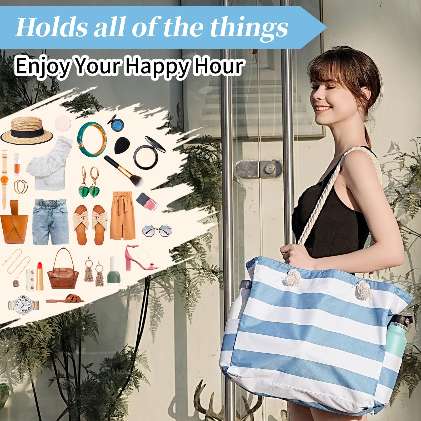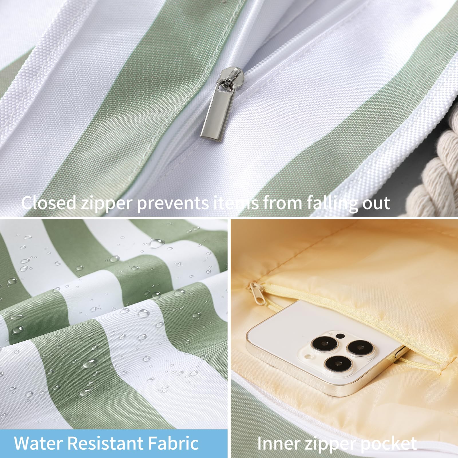 - The beach bag can securely store all your stuff, like lotions, lipstick, beach towel, beach hat, beach toys, coke, wallet, flip flops, sunglasses, sunscreen, swimsuit and other necessities.