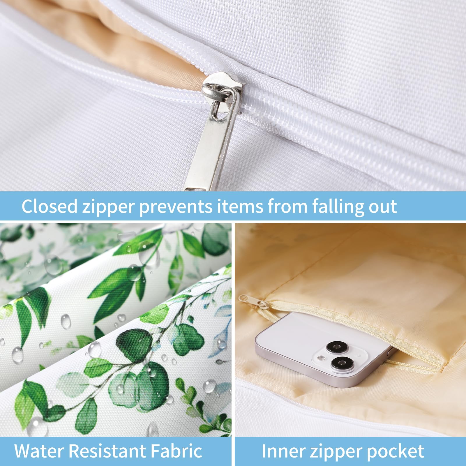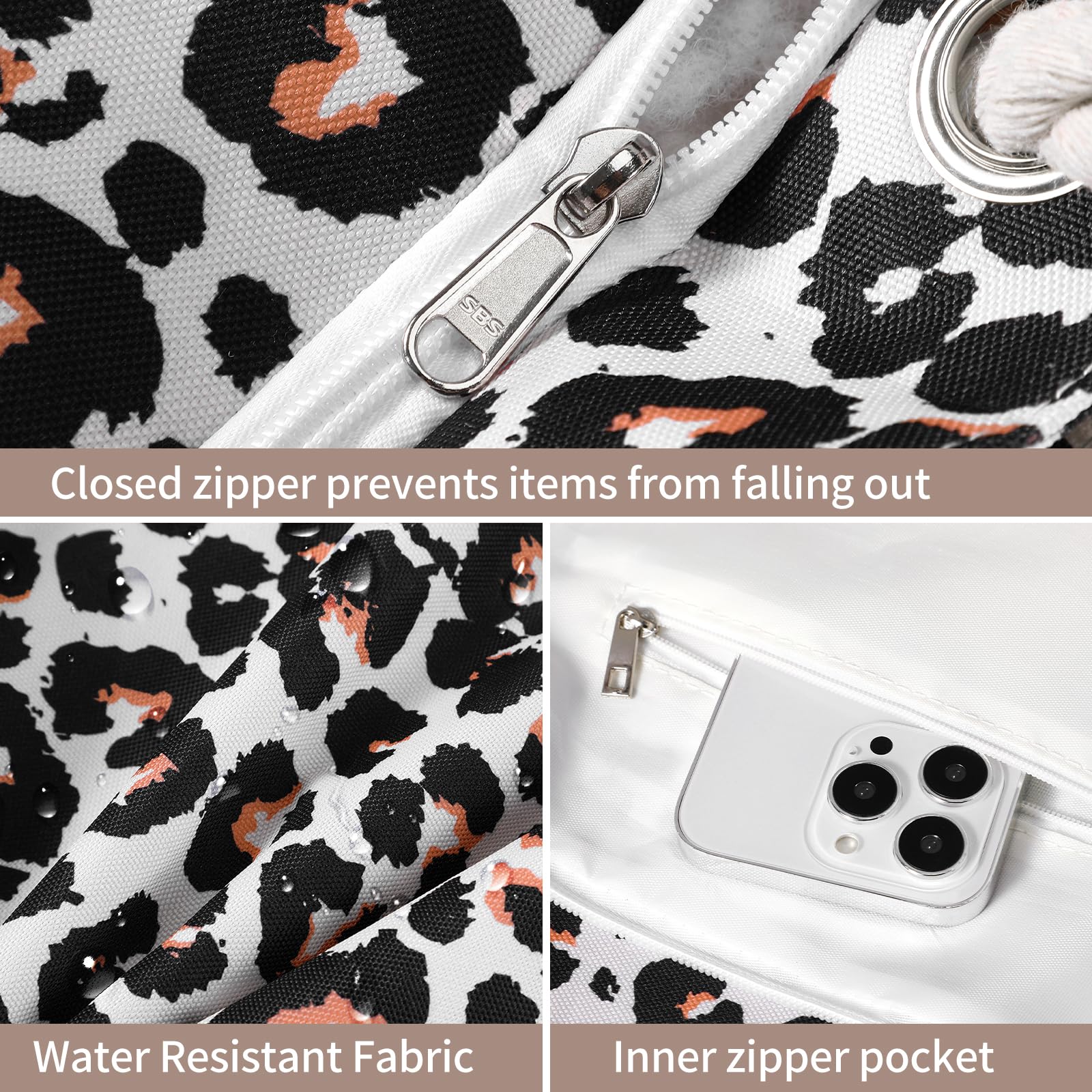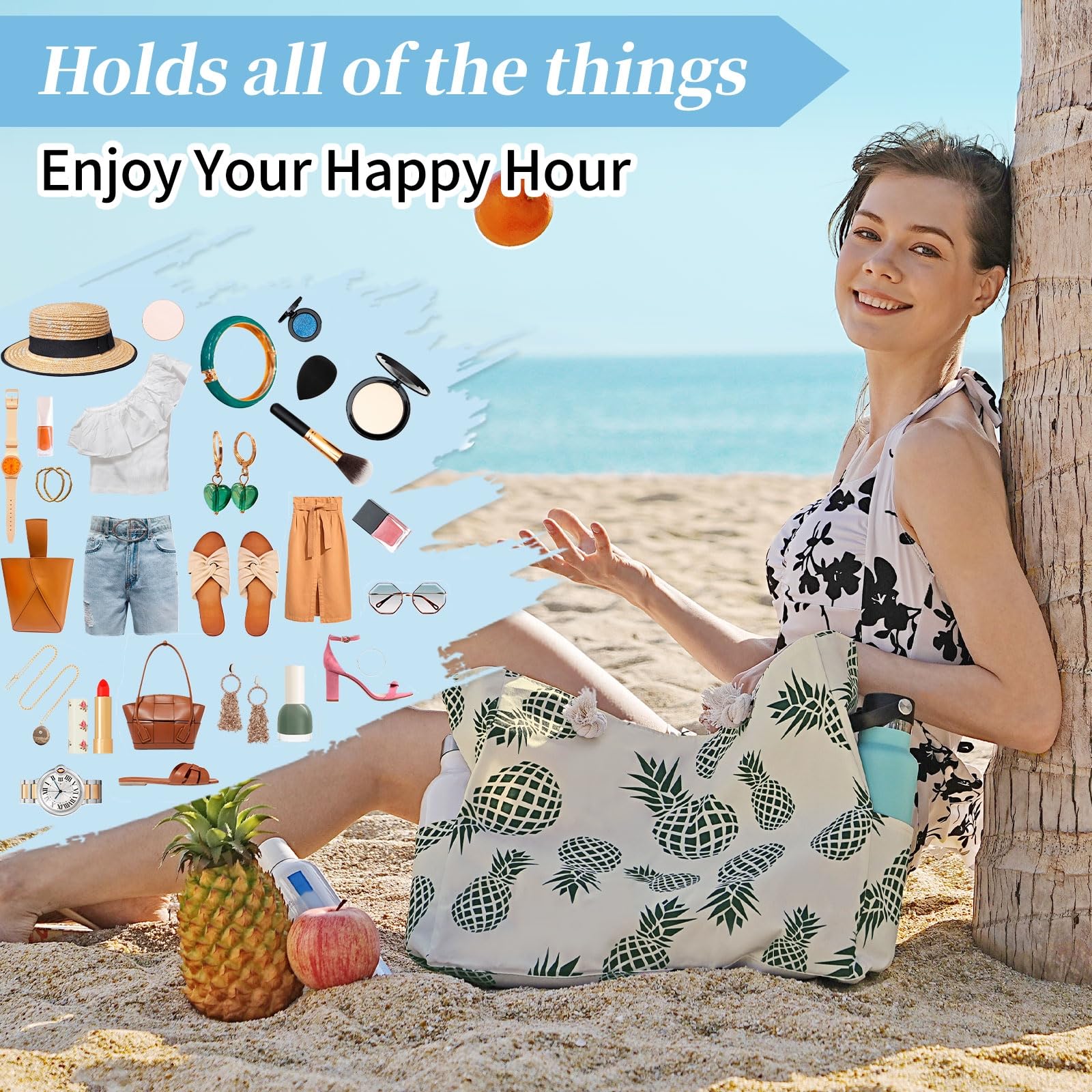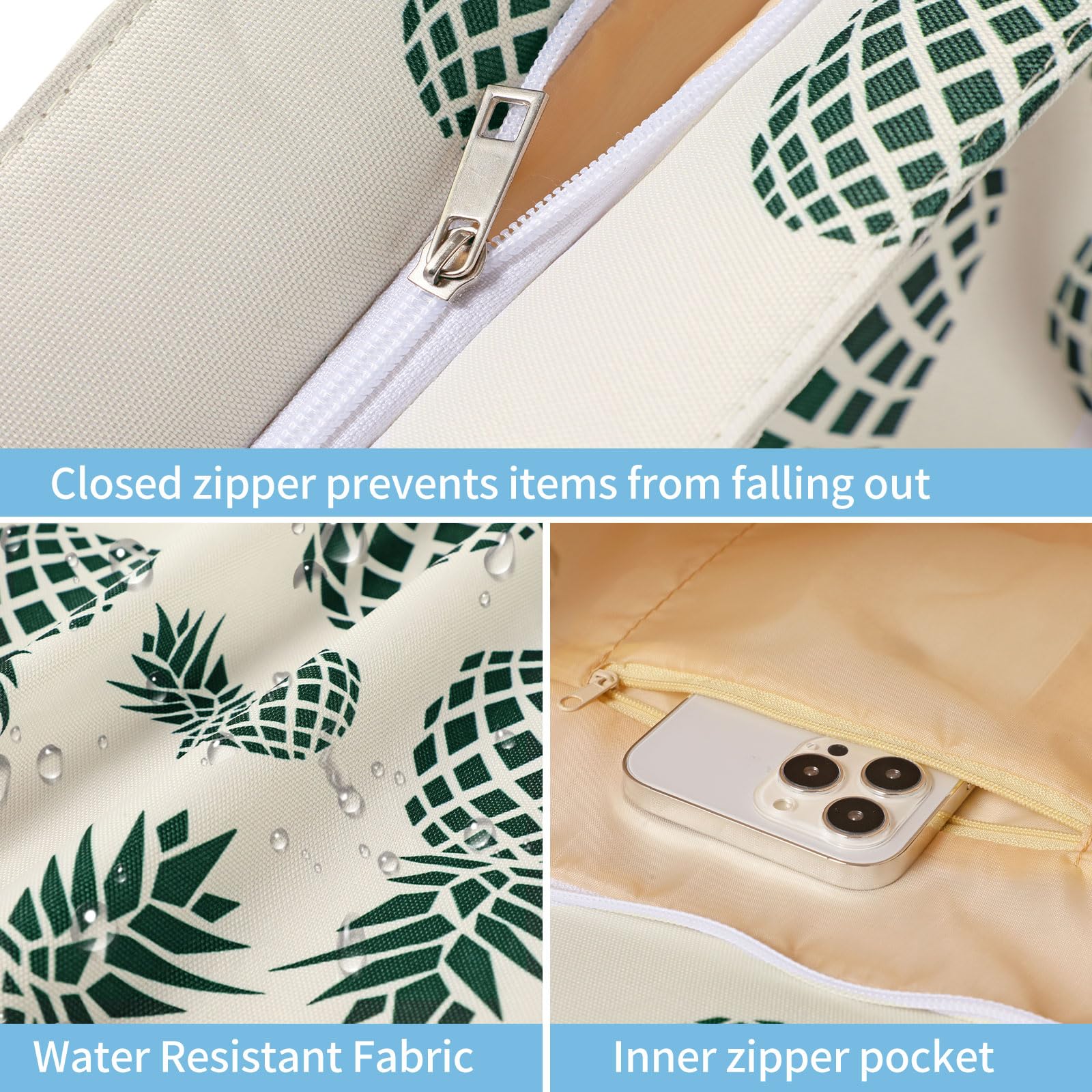 - The beach bag can securely store all your stuff, like lotions, lipstick, beach towel, beach hat, beach toys, coke, wallet, flip flops, sunglasses, sunscreen, swimsuit and other necessities.