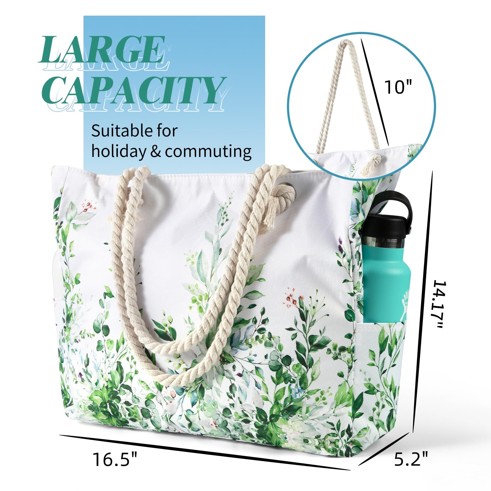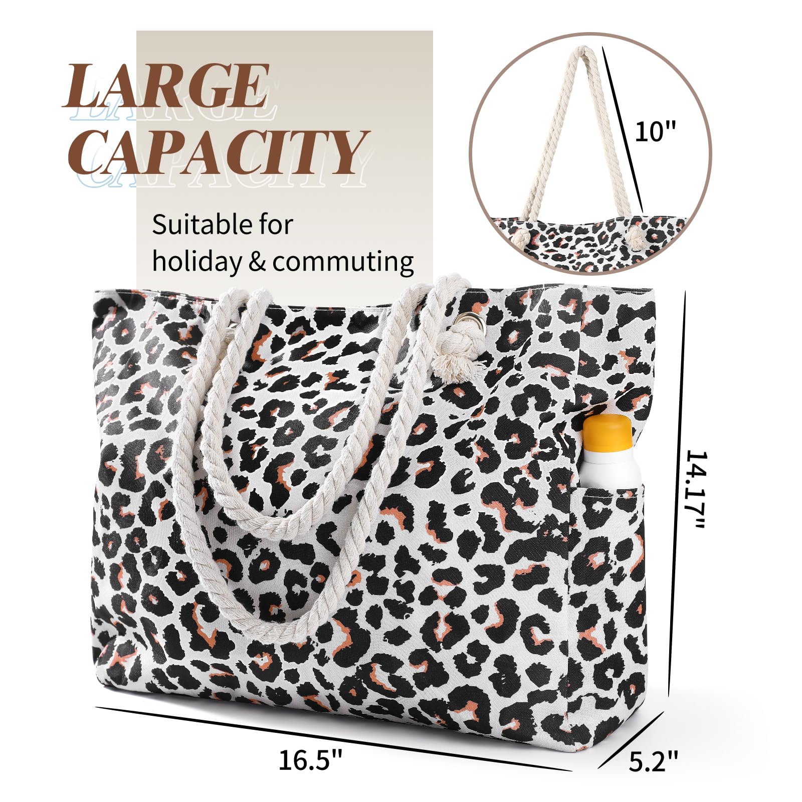 - Large Beach Bag: Size at L16.5" x H14" x W5.2", it can securely store all your stuff, like lotions, lipstick, beach towel, beach hat, beach toys, coke, wallet, flip flops, sunglasses, sunscreen, swimsuit and other necessities