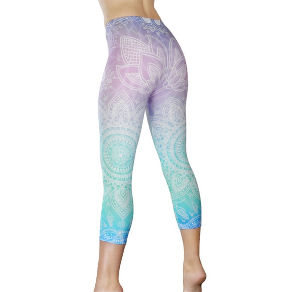 Stylish ombre yoga leggings with a pink to green gradient. Features a mandala pattern. Perfect for workouts.