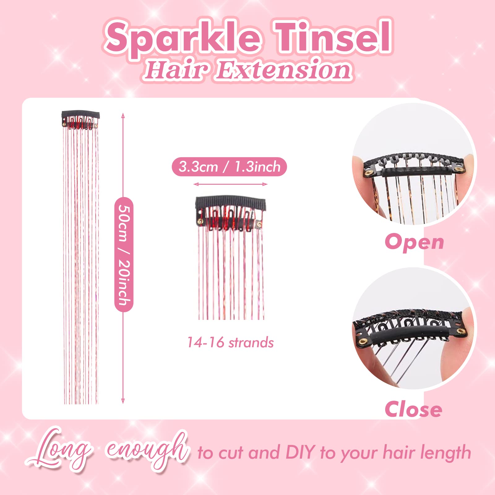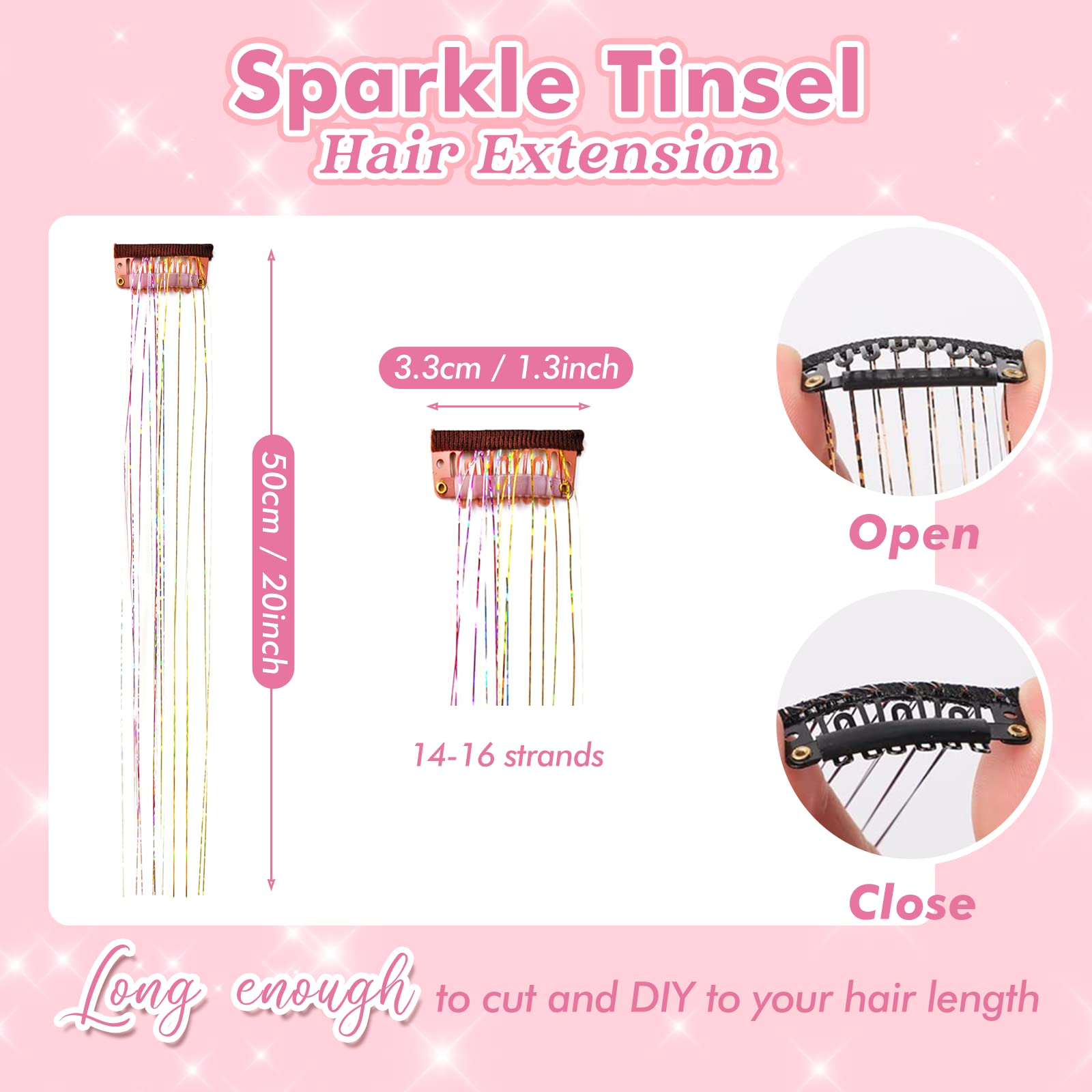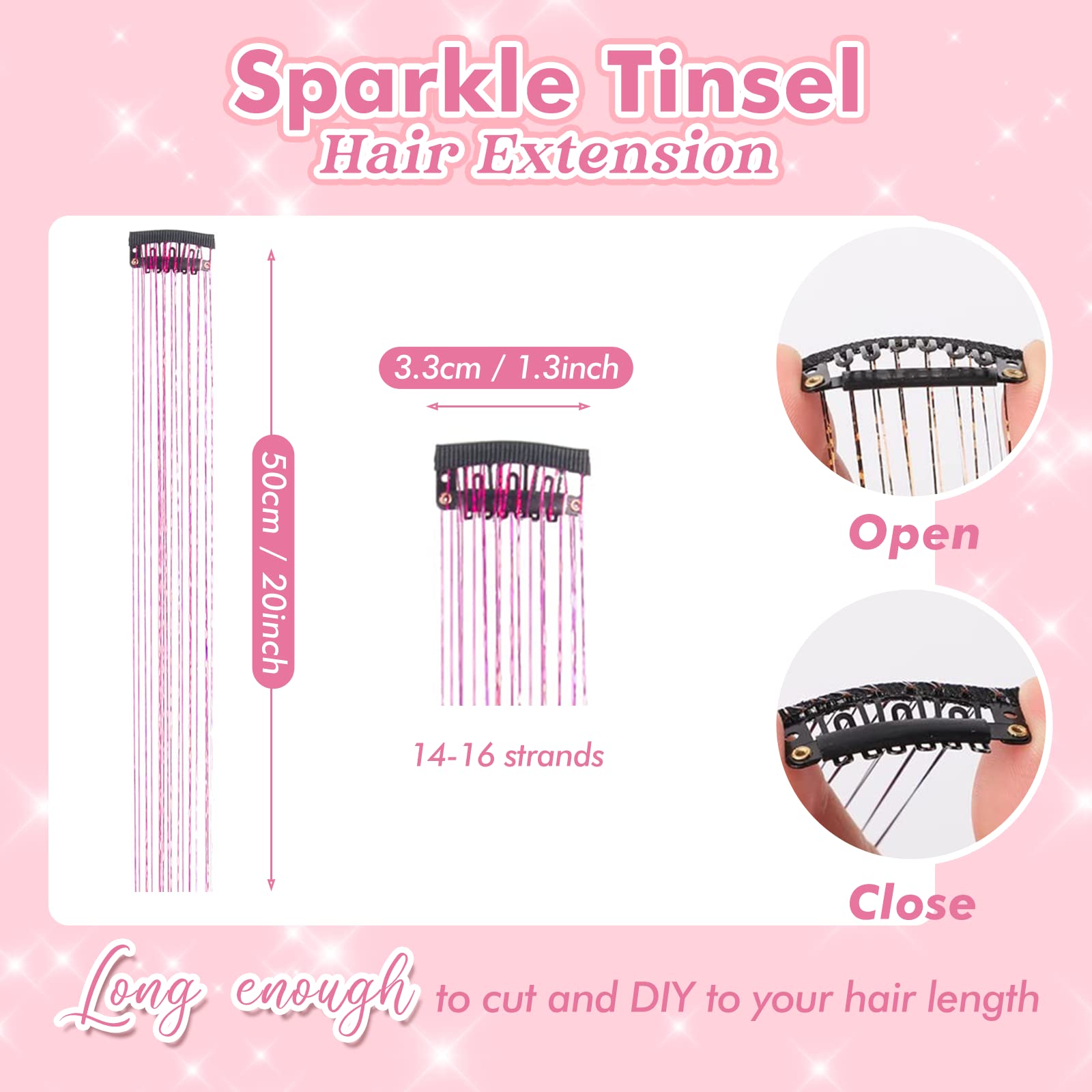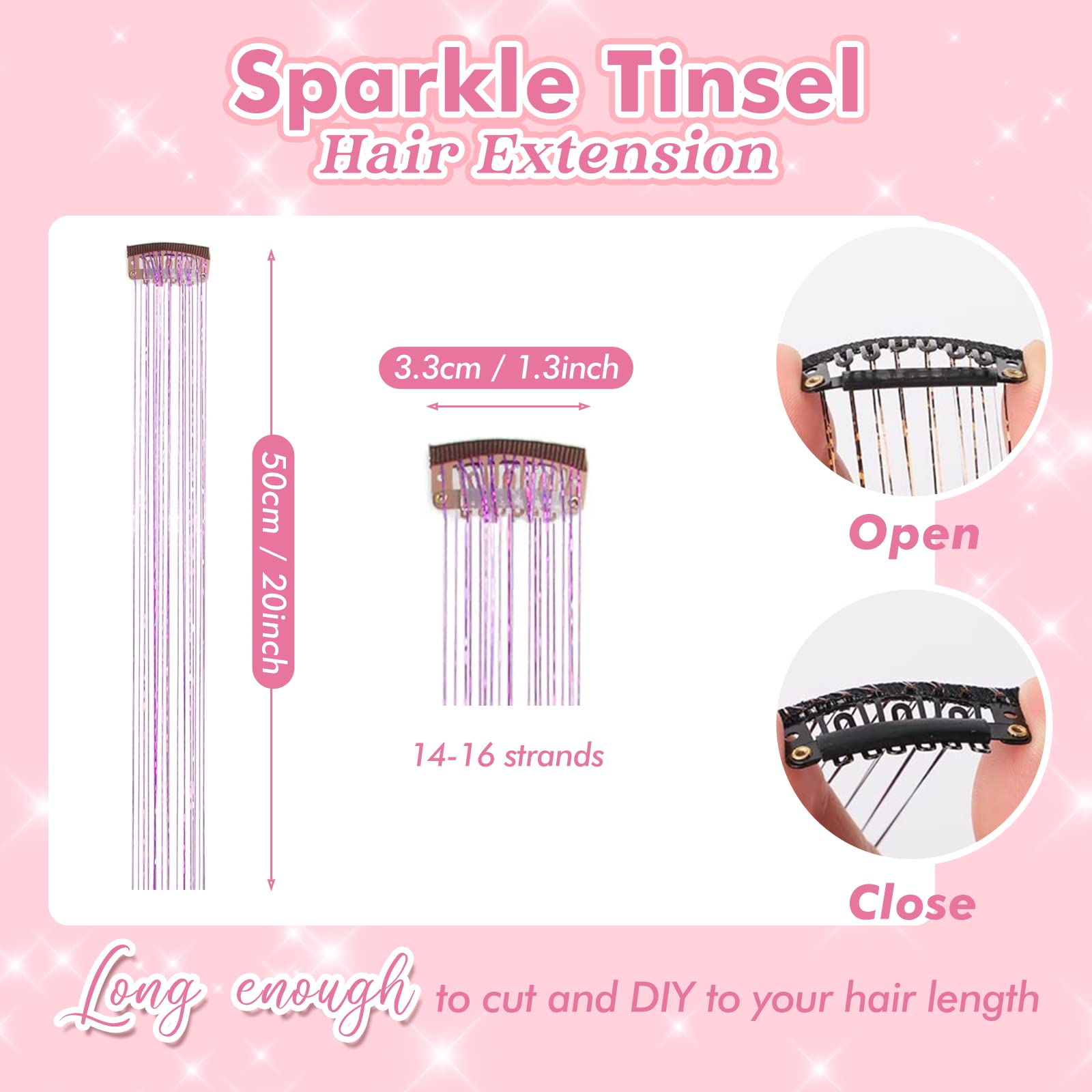 - 【Heat Resistant & Long Enough】The clip in glitter hair tinsel extensions can be styled heated resistant. You can wash, comb, blow dry, straighten, curl and cut the clip-in tinsel hair. Fairy clip in tinsel Hair measures 20 inch/ 50cm, long enough that you can cut it to different lengths according to your hair extension requirements. You can clip tinsel hair on ponytails, buns, and braids, easy to use and can be reused. The perfect hair accessories for girls of all ages.