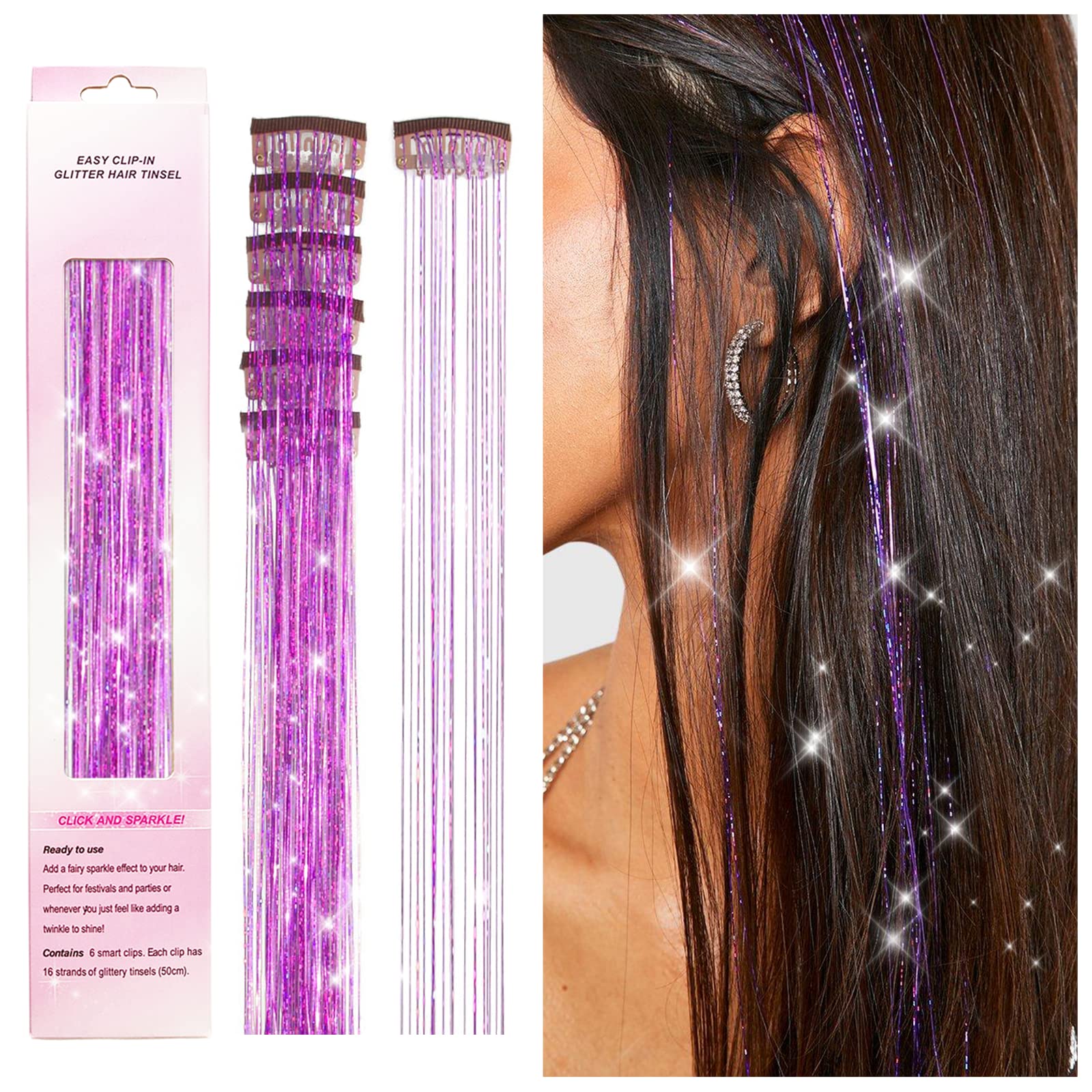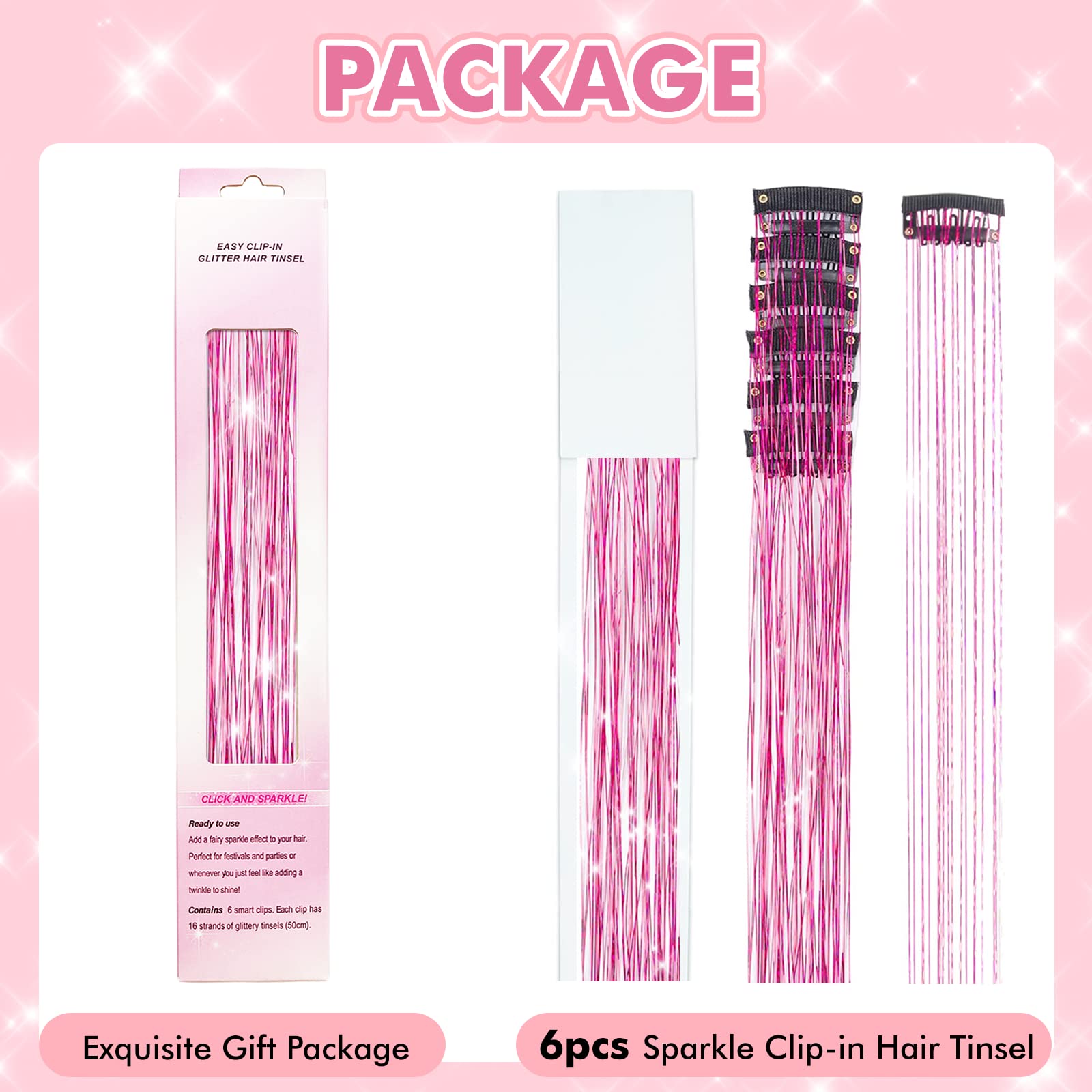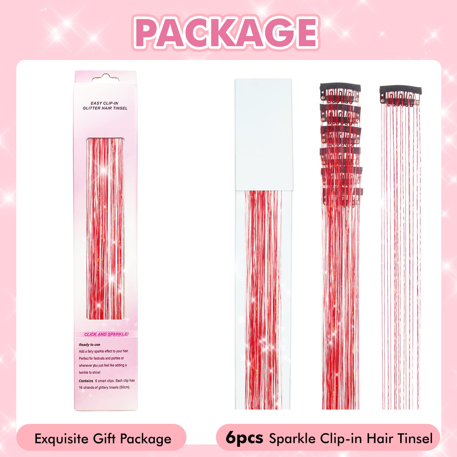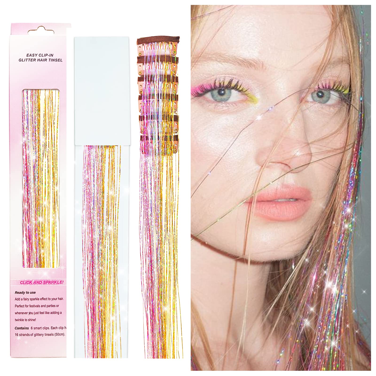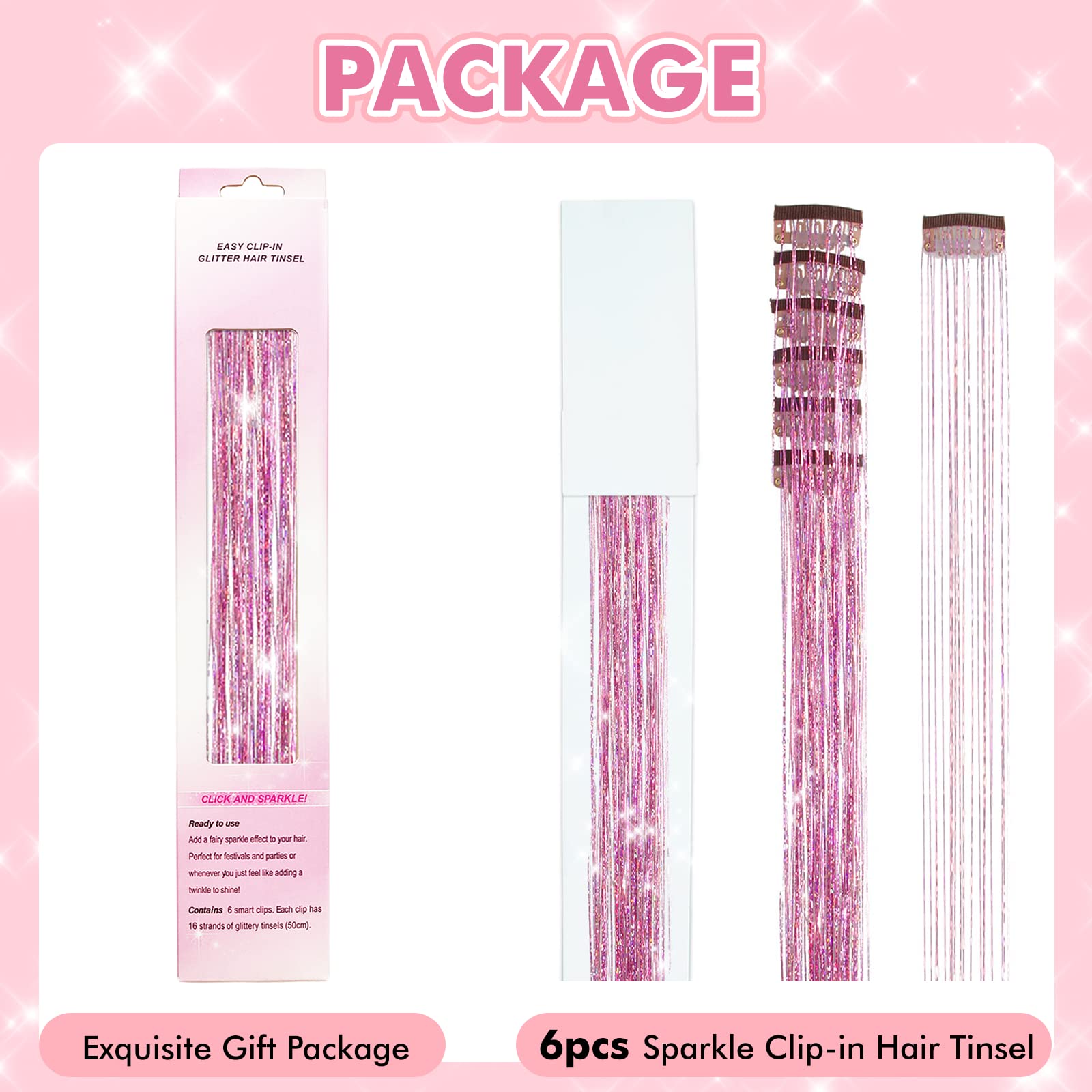 - 【Sparkling On Any Occasion】6 PCS clip in hair tinsel kits comes with a beautiful pink exquisite gift packaging, as an attractive gift for kids, friends or family to embark on a sparkling journey together. Each clip has 16 strands of glitter shiny tinsel hair for everyday styling to add luster. Suitable for all holiday events, daily dress up, costumes, music festivals, cosplay, weddings, parties, Halloween, Christmas and more. Making you be charming and stand out in the crowd.