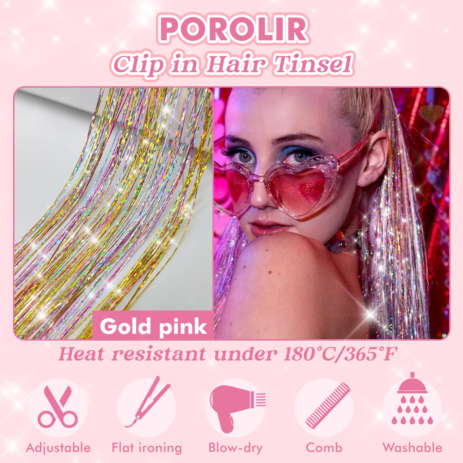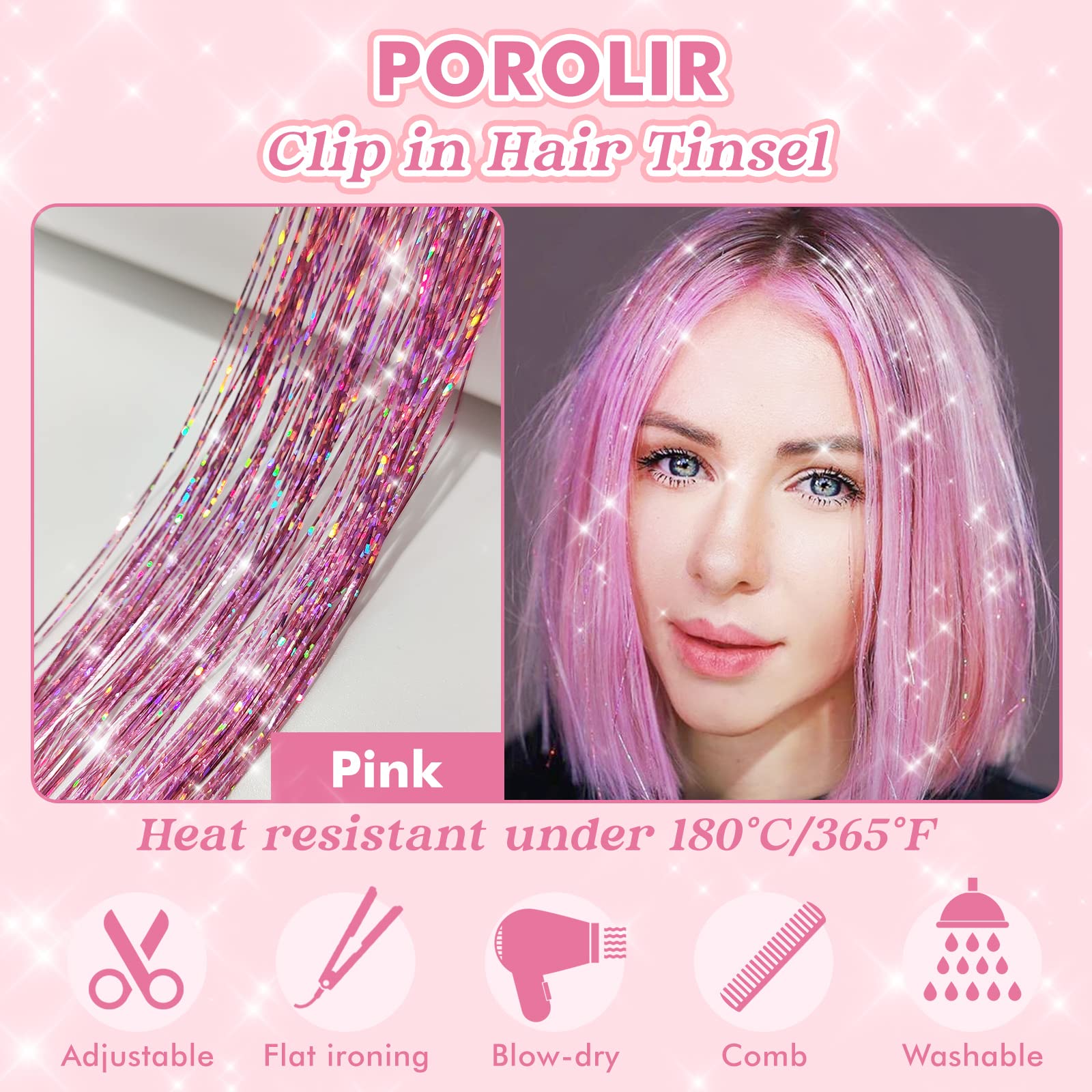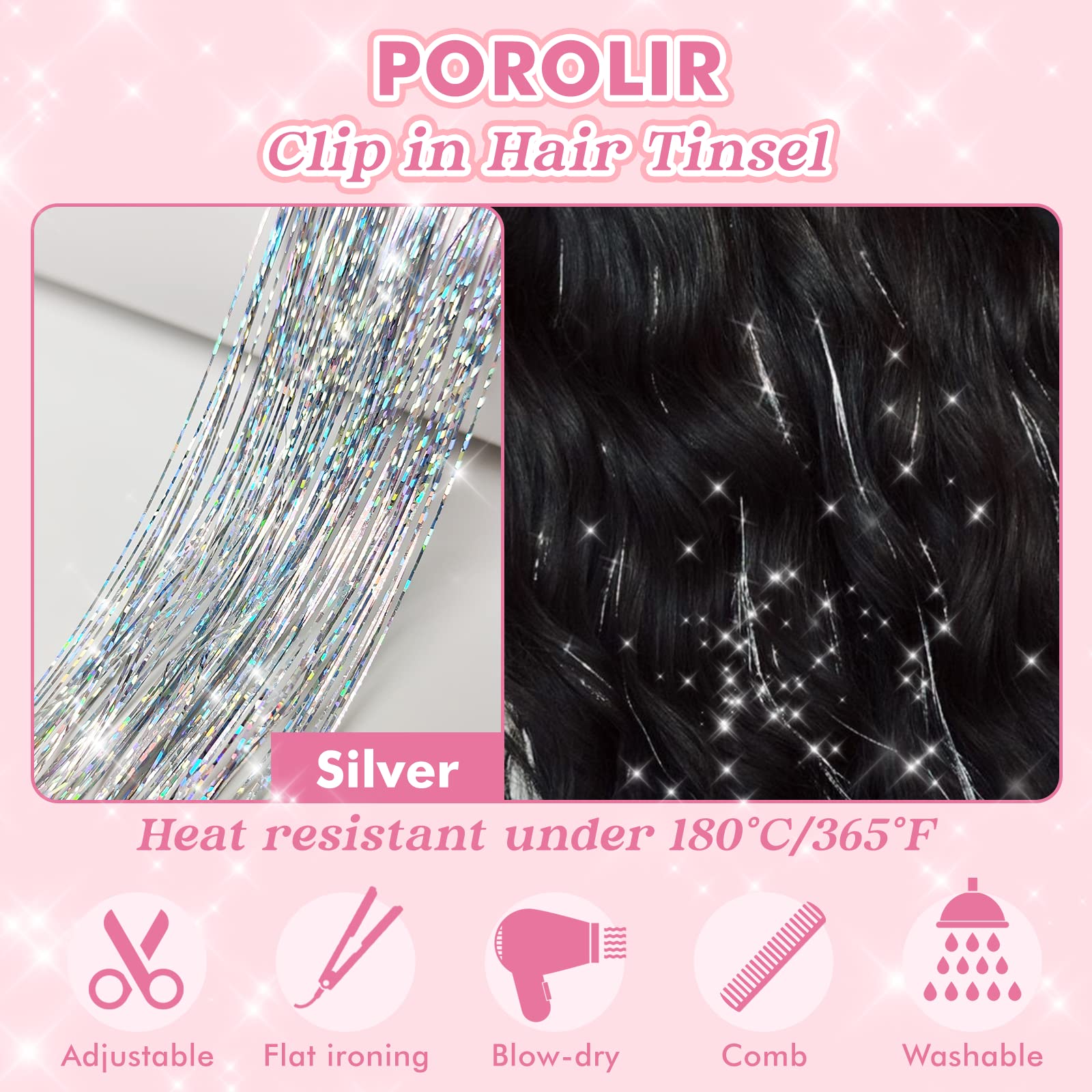 - 【Easy to Use】1 Second Instant Sparkling. POROLIR Clip in hair tinsel design, no need skill tools to blend the glitter hair extension strands pertfectly into your hairs. Just open and close the clips easily, you will get a sparkling and glamorous style instantly anytime, anywhere. [Saving your valuable time] POROLIR reusable clip-in hair tinsel is easy to cut and style.
