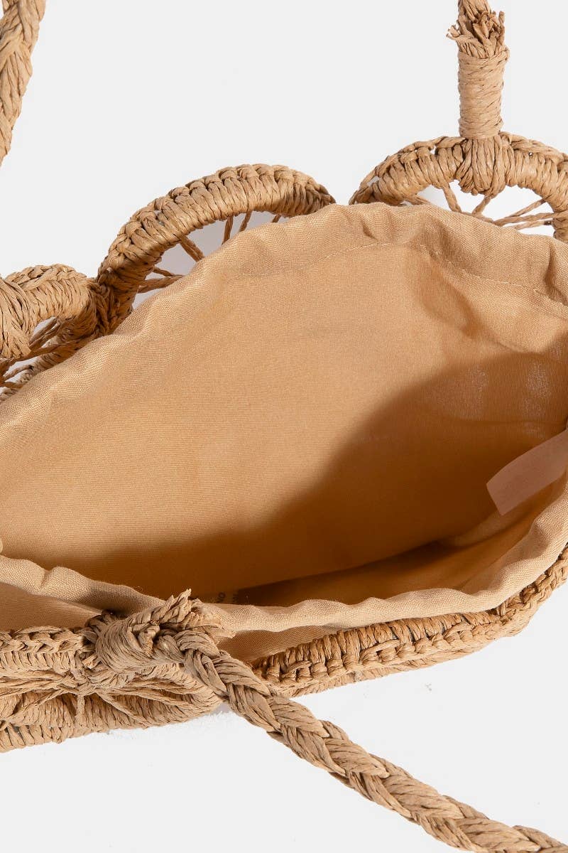 This hand bag features a fashionable intricate braided wheels style with a removable inner pouch. Discover the perfect balance of subtlety and flair as this hand bag effortlessly completes your look.