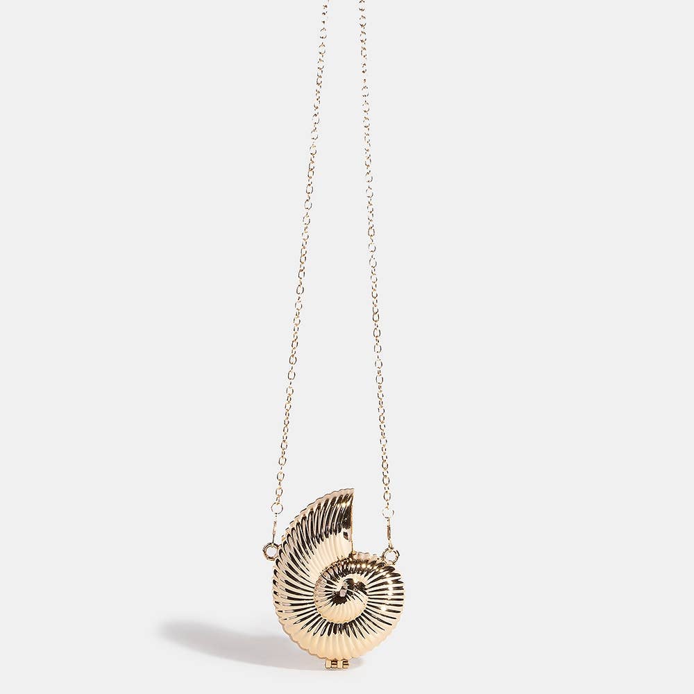 This clutch bag showcases a unique metallic sea shell clutch coin purse style. Unveil modern elegance with this subtly intricate clutch bag.