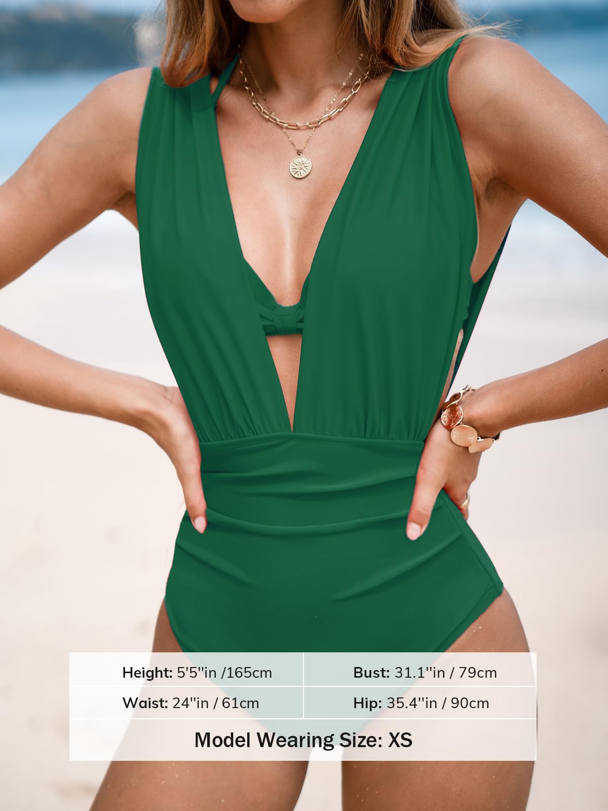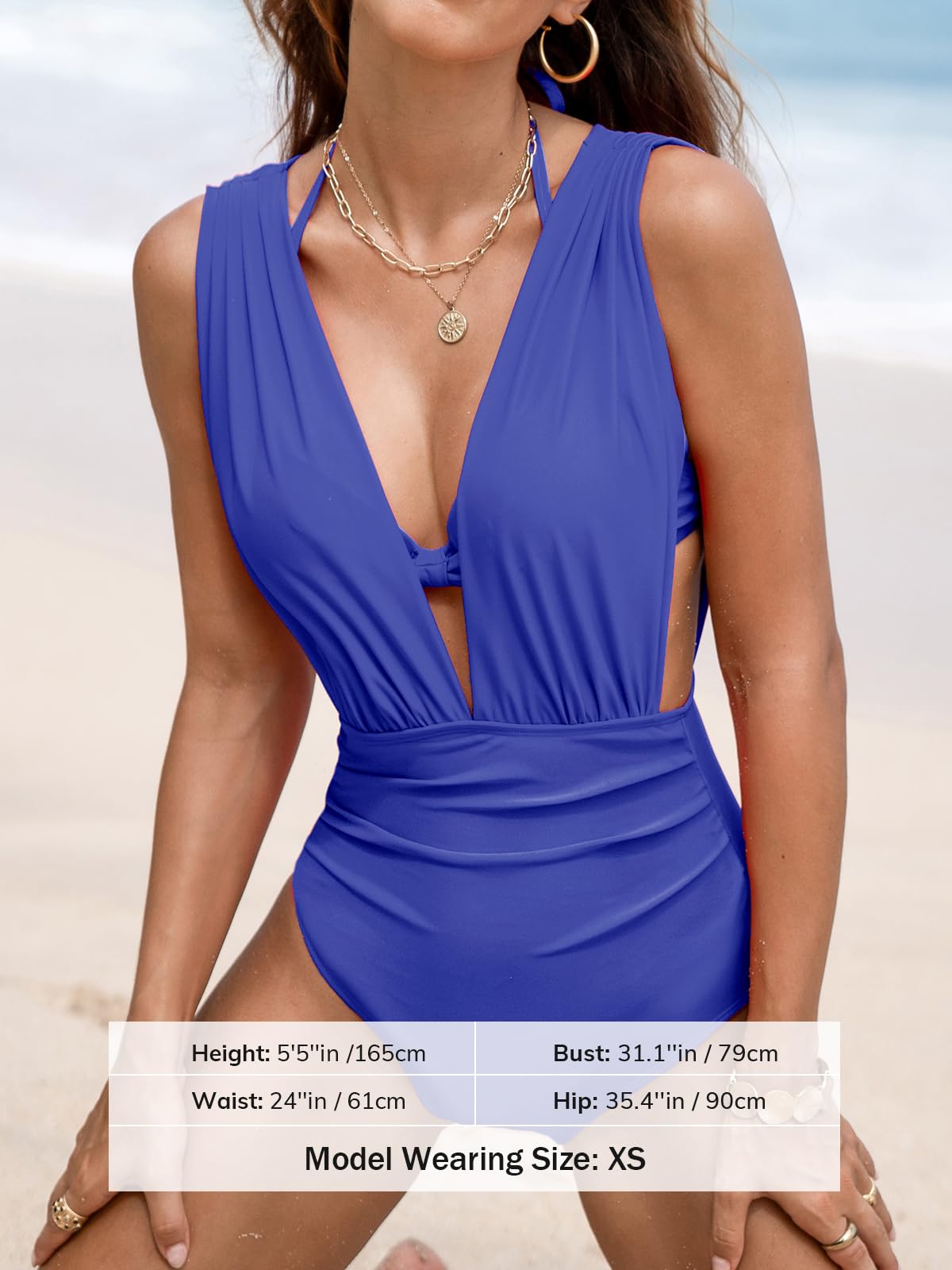 CUPSHE Women's One Piece Swimsuit Halter Plunging Neck Bathing Suit Wide Straps Underwire Ruched Back Hook