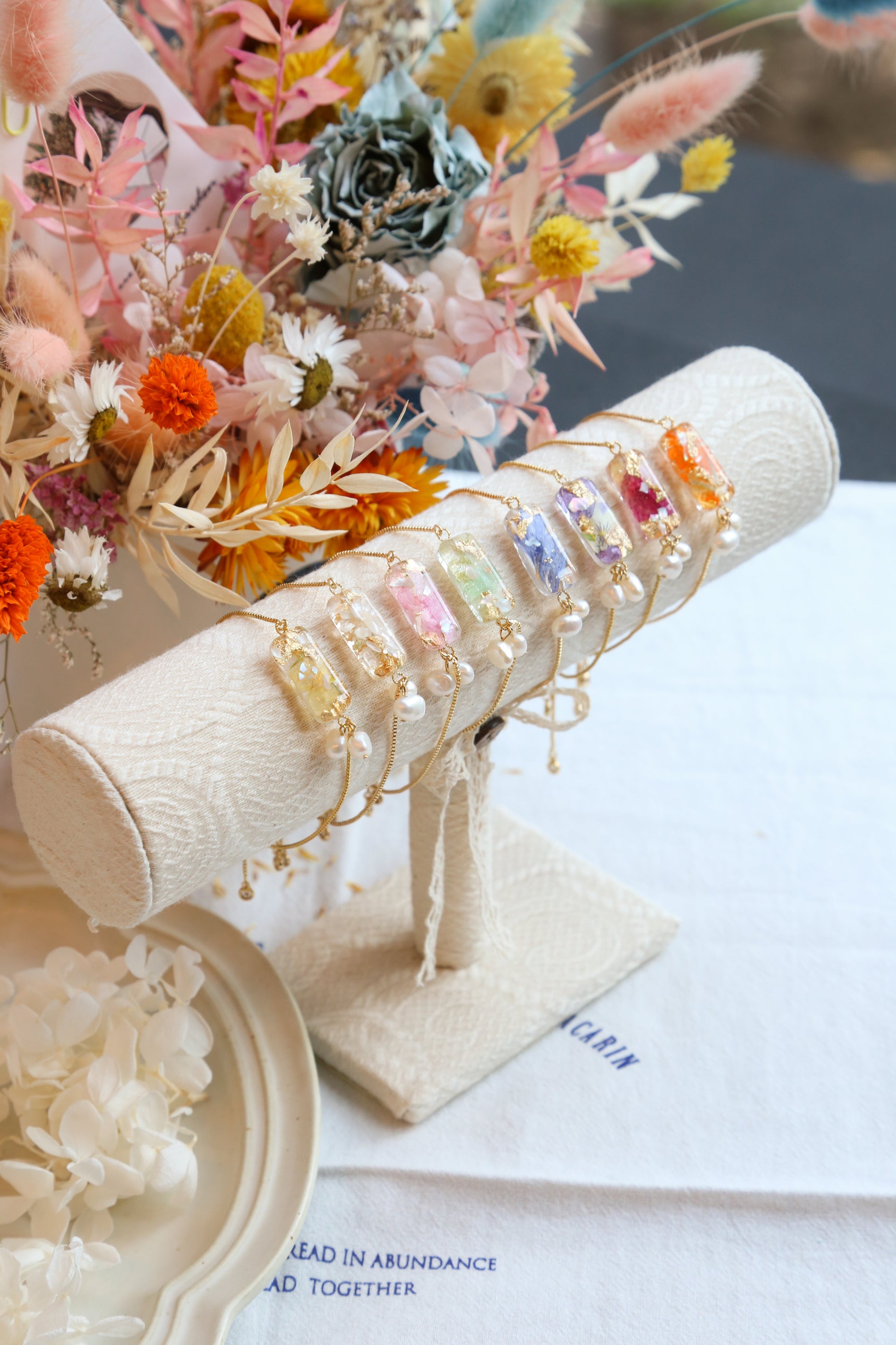 This preserved flower bracelet features seasonal flowers and two natural pearls. Available in GOLD!