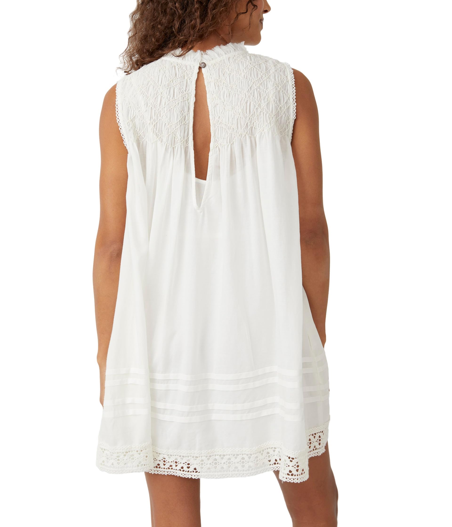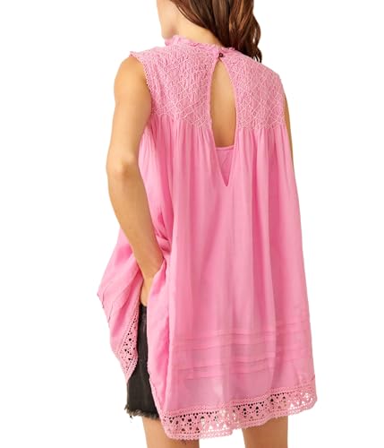 Features: Soft cotton-blend, printed detail all over, subtle scoop neckline with raw trim, sleeveless style, contrast lace trim, keyhole cutout at back with button closure
