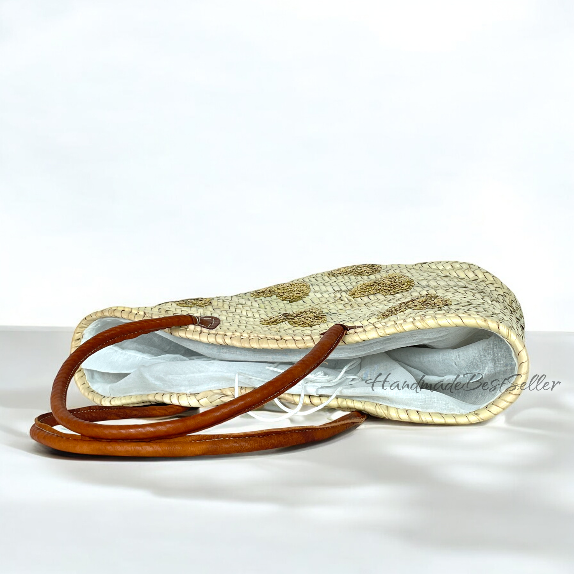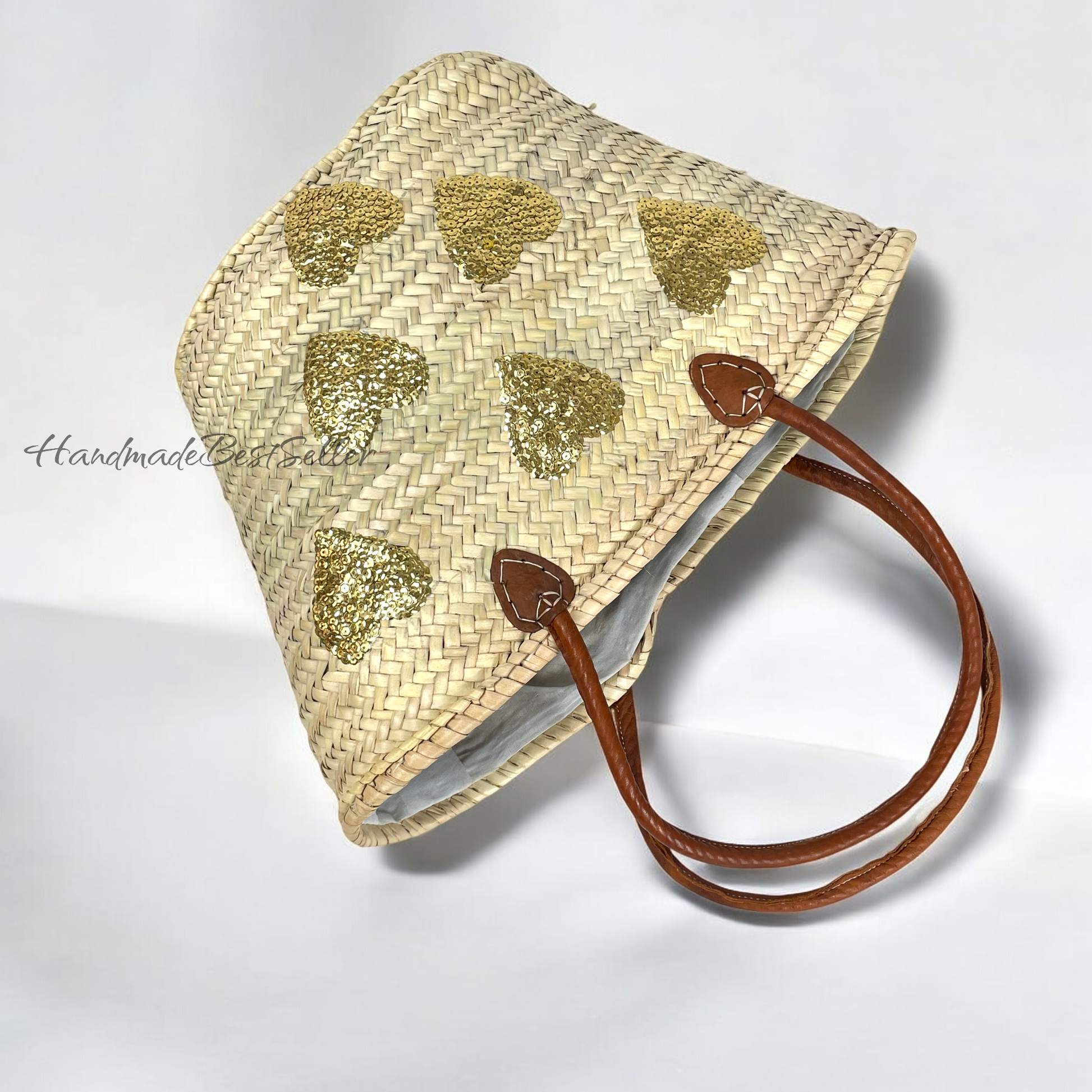 HandmadeBestSeller - Straw Bag with Leather Handles and Heart Sequin Design