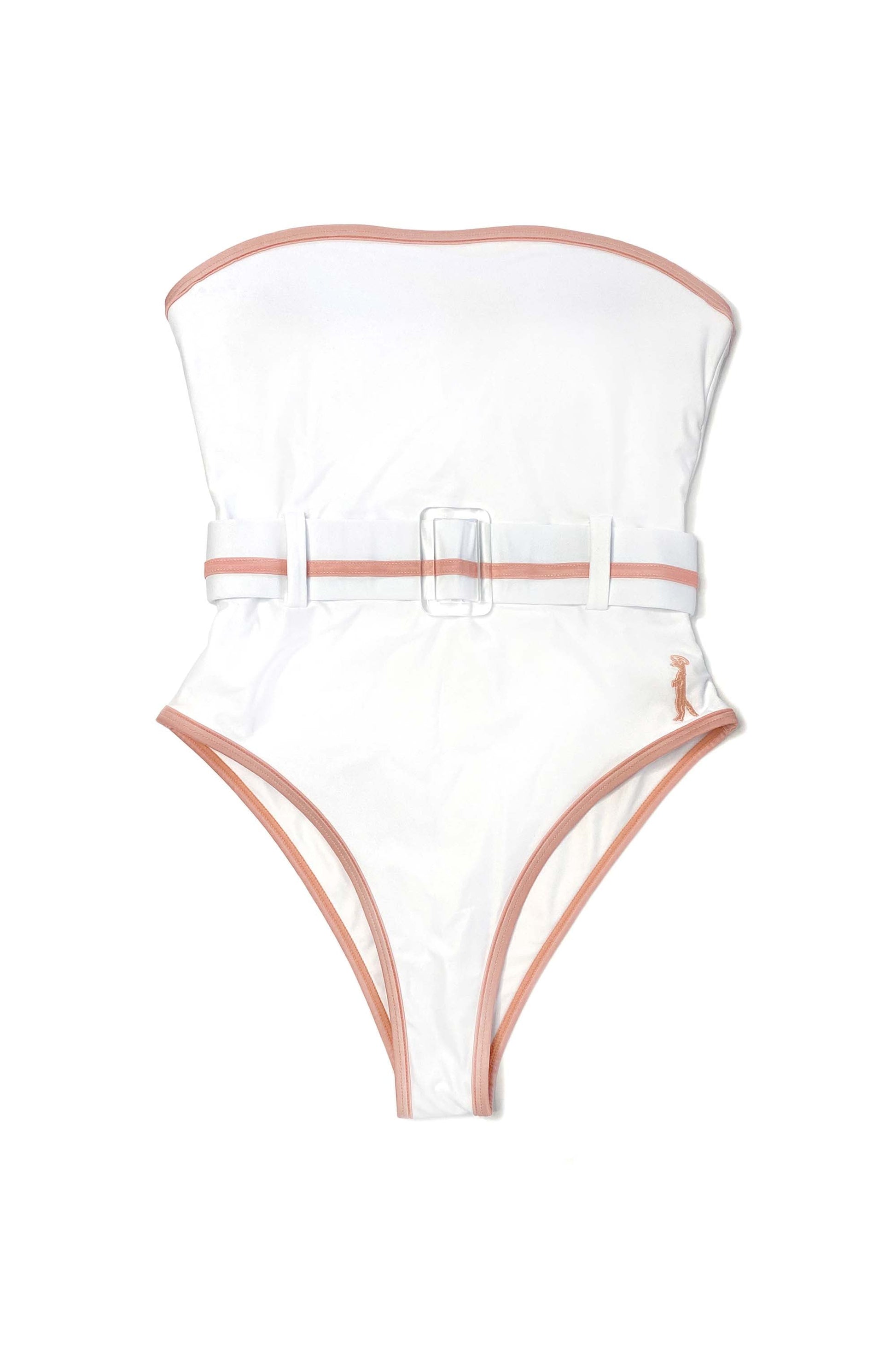 Our Bond girl dreams have come true! This beautiful strapless one piece has a removable belt...y'know, in case you need to wrangle some lobsters or tie up the bad guys.