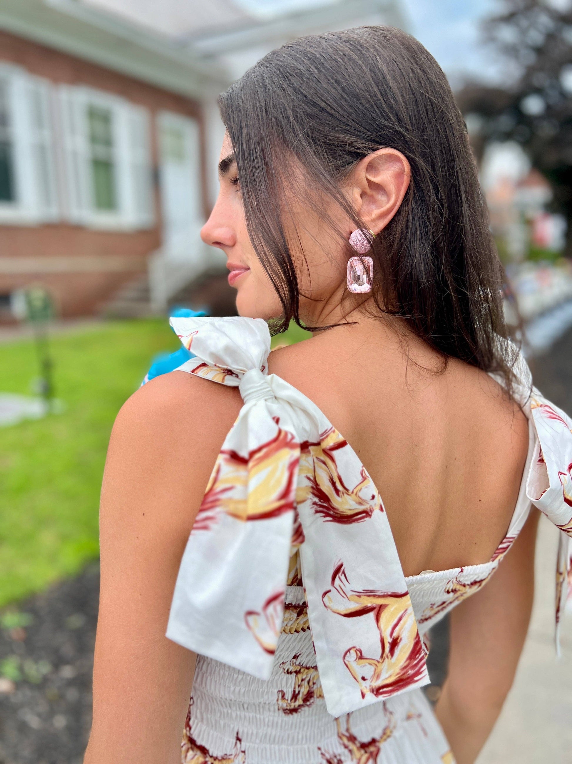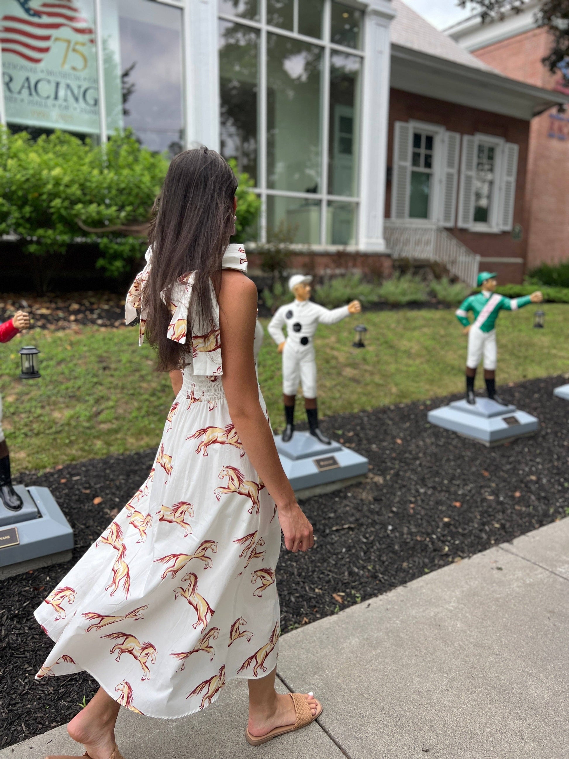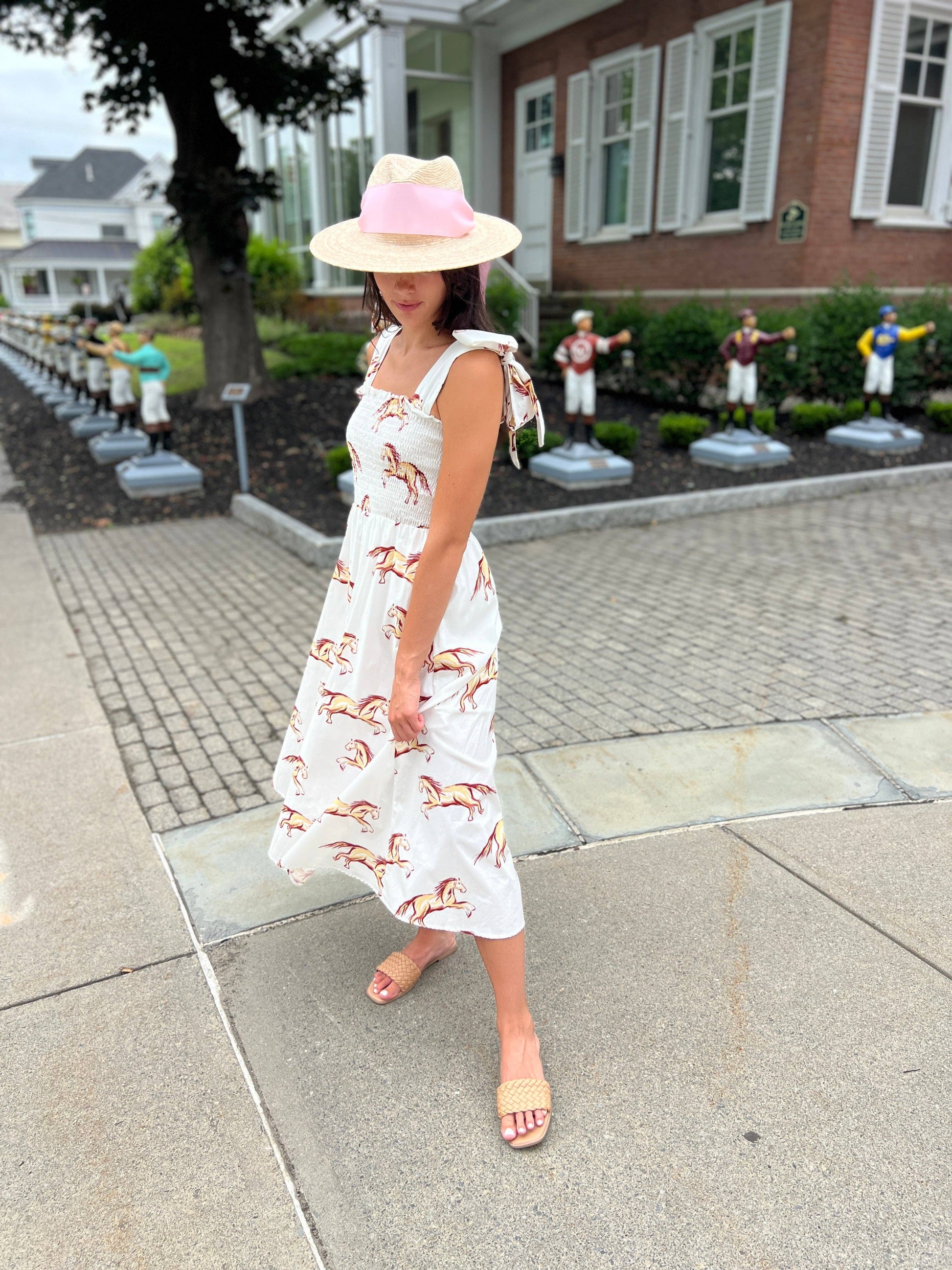 Our top-selling Emma Bow Maxi Dress in a new horse print, perfect for celebrating the excitement of Saratoga Horse racing season.