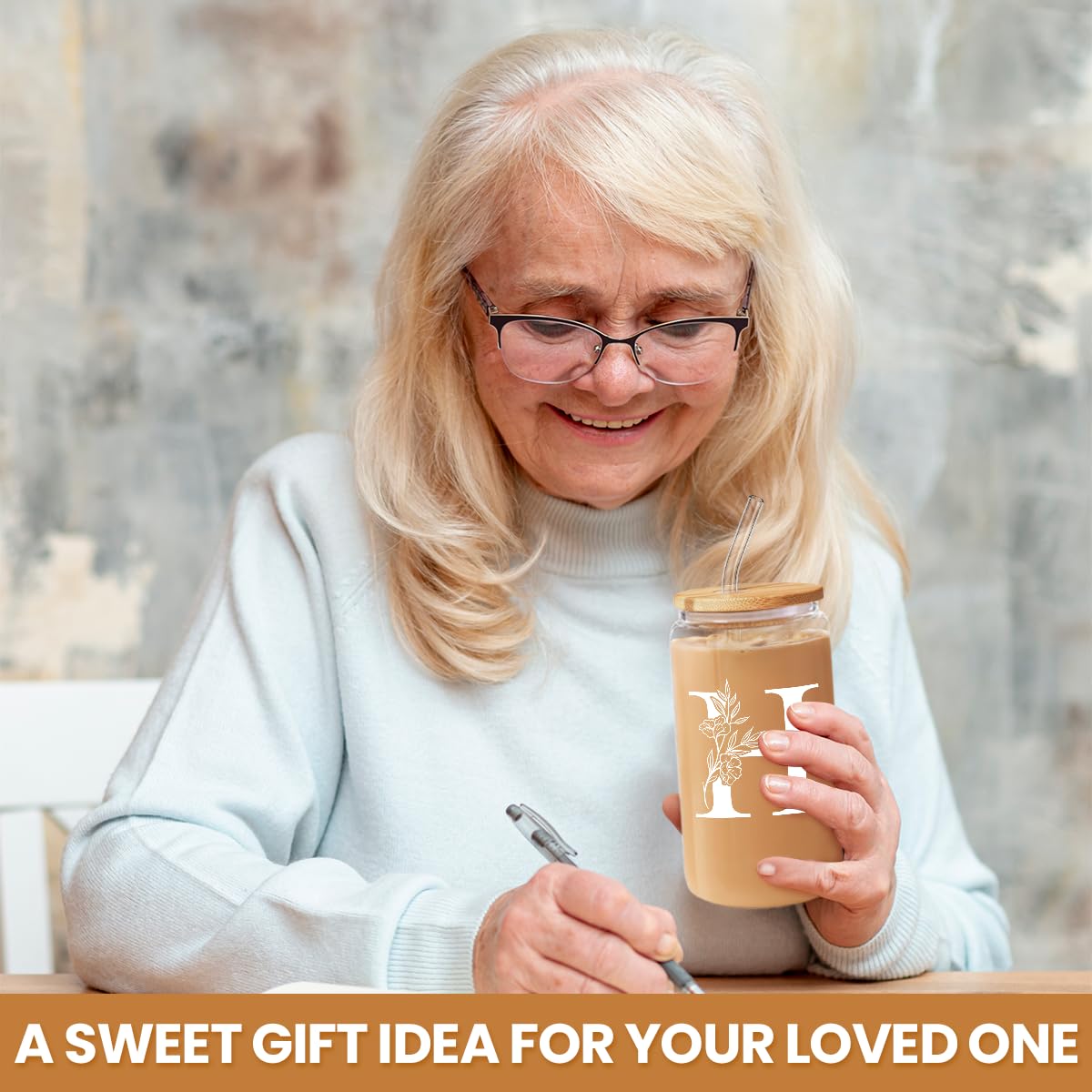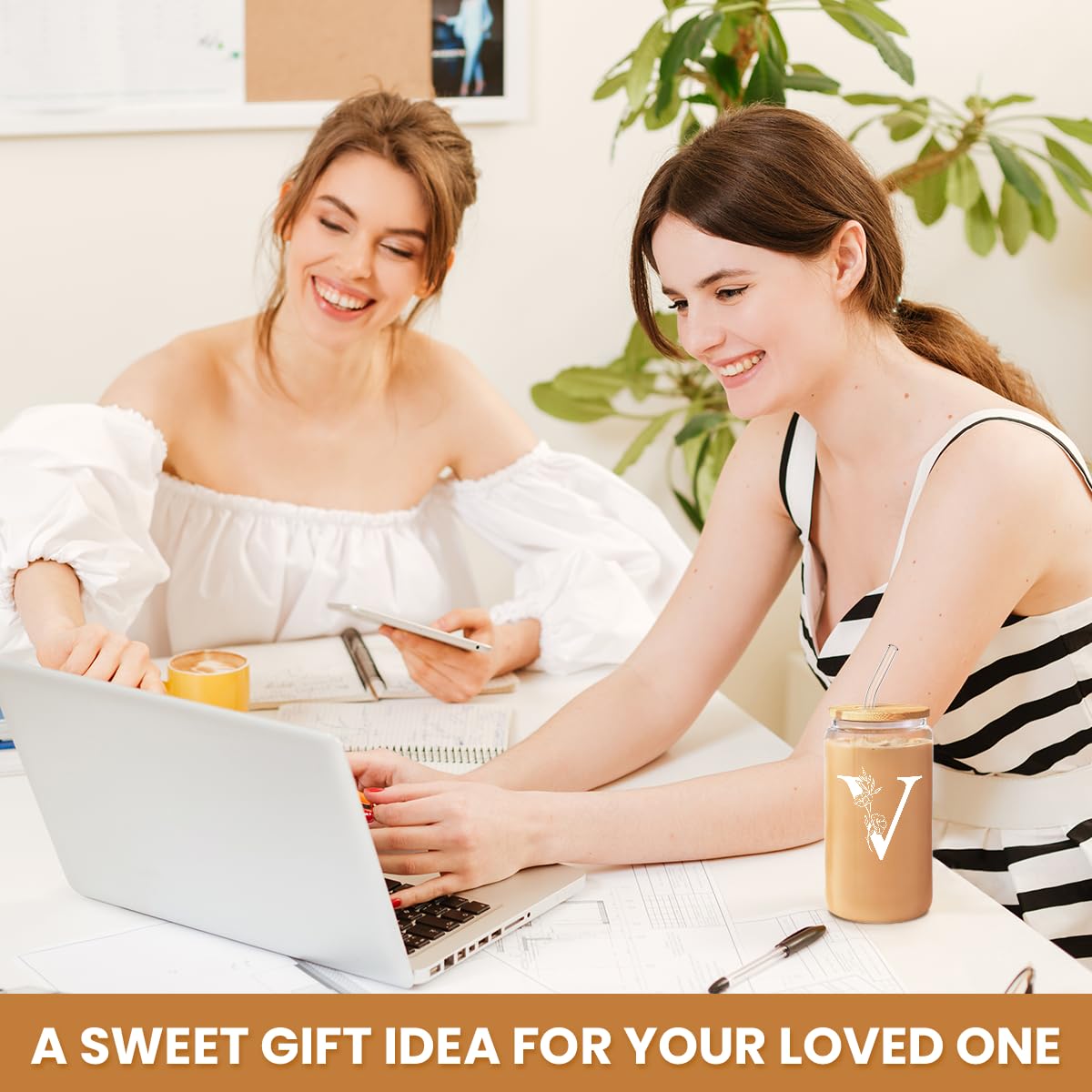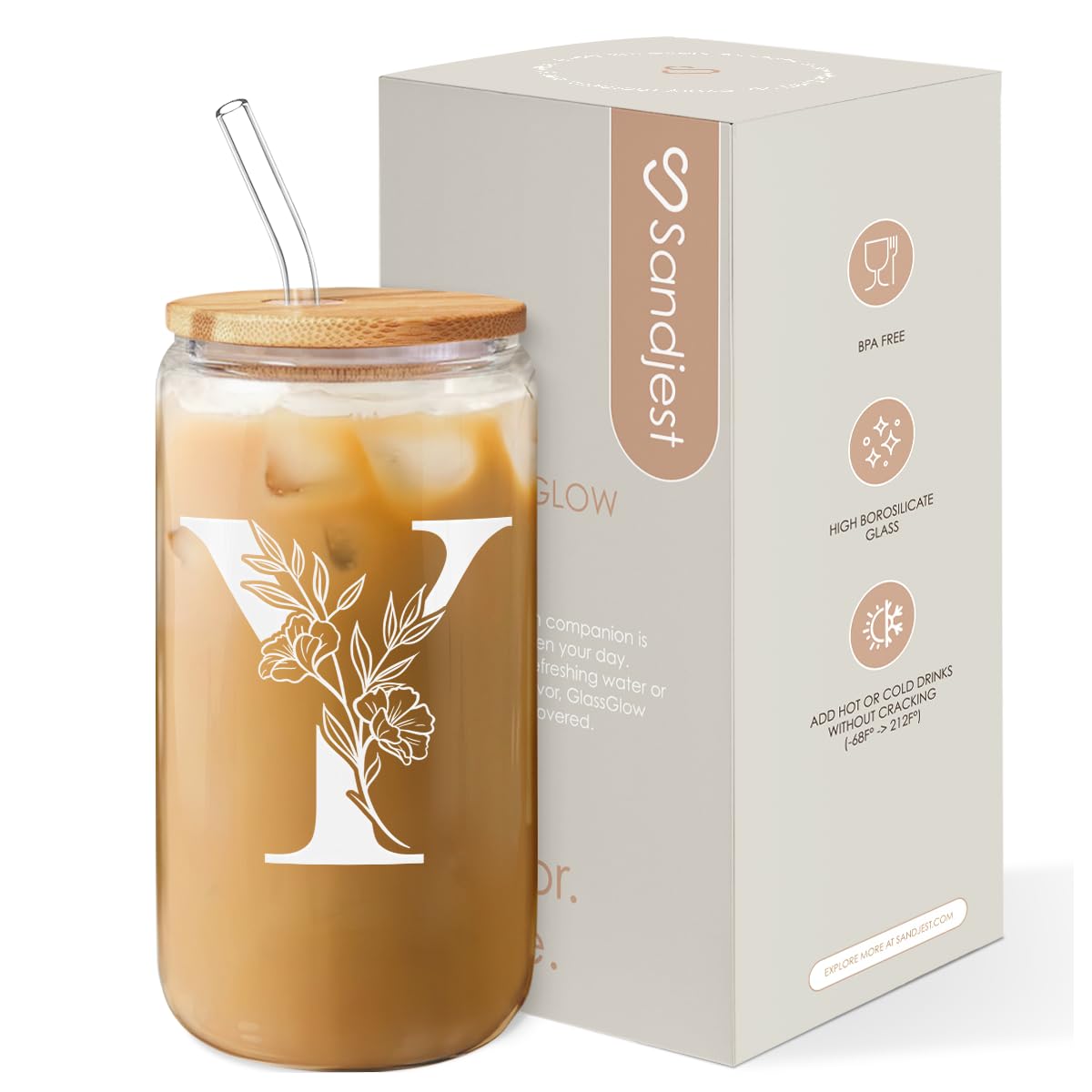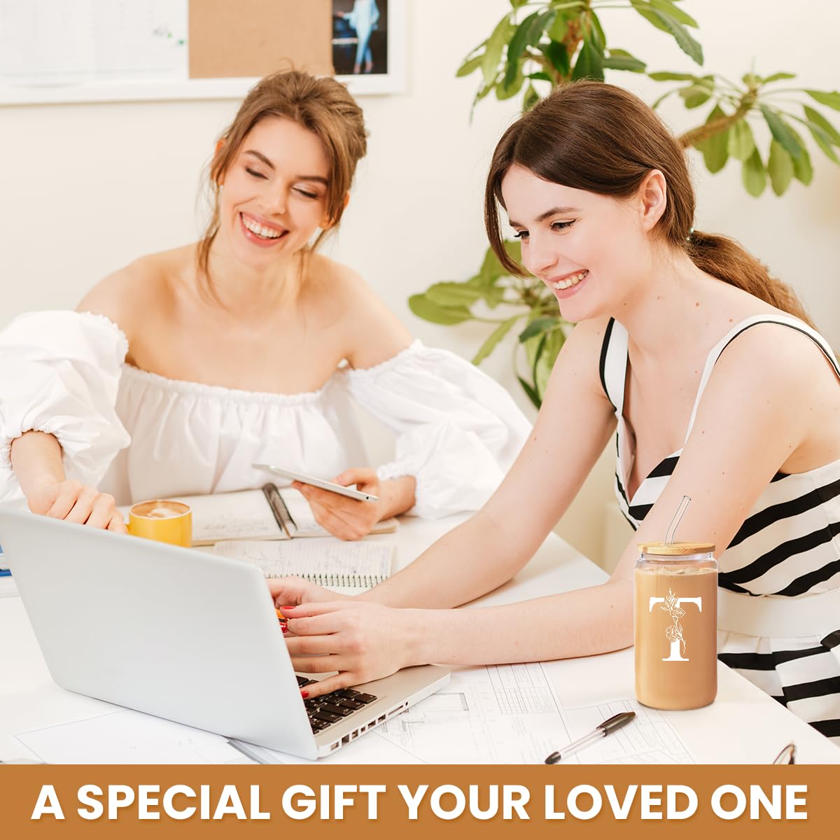 SANDJEST Monogrammed Gifts for Women - Monogram D Initial Glass Cup 16 Oz Can Coffee Cups with Lid and Straw - Monogram Initials Gifts for Womens on Birthday