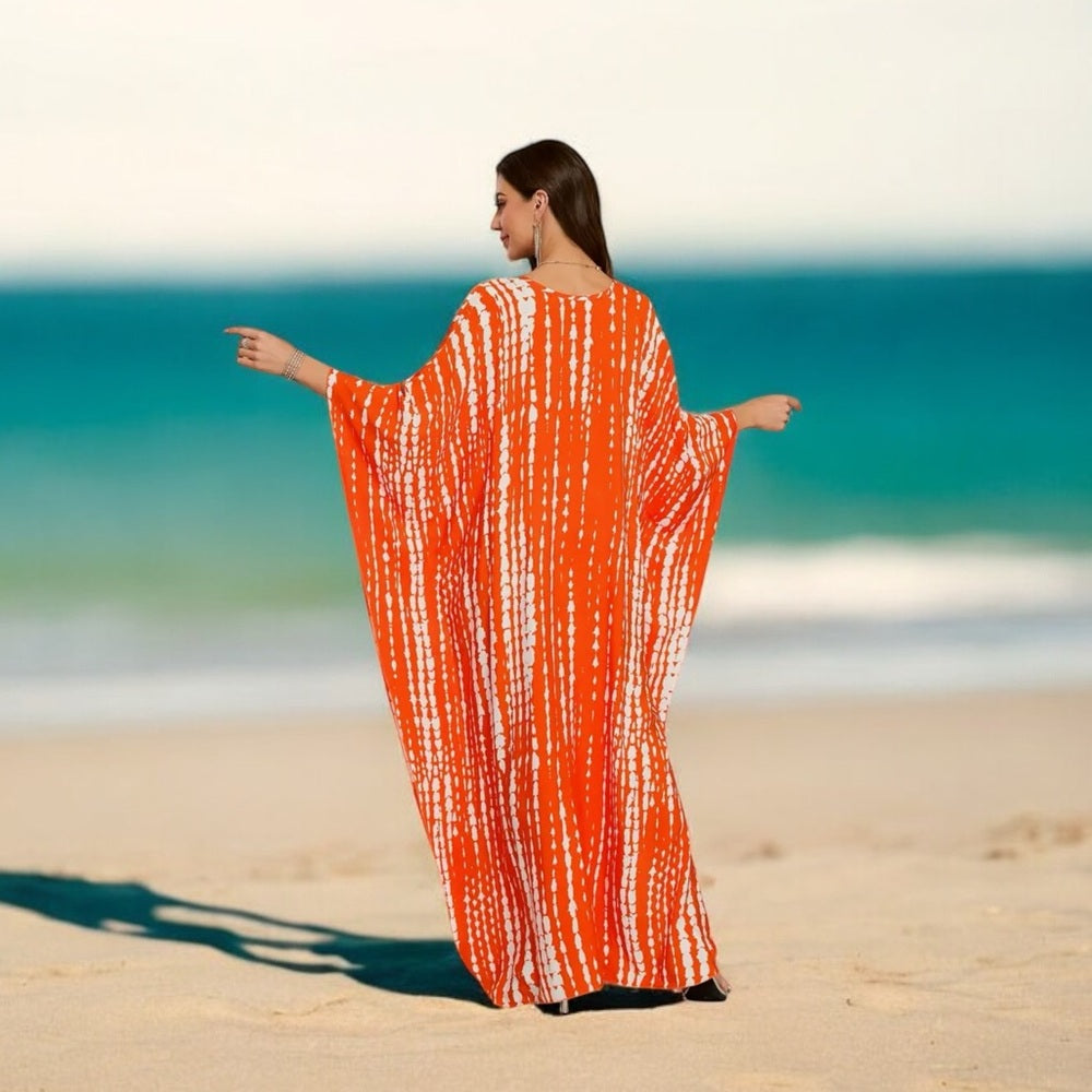 Stunning orange, turquoise, and navy kaftan dress with white patterns. Perfect for a bold and stylish look.
