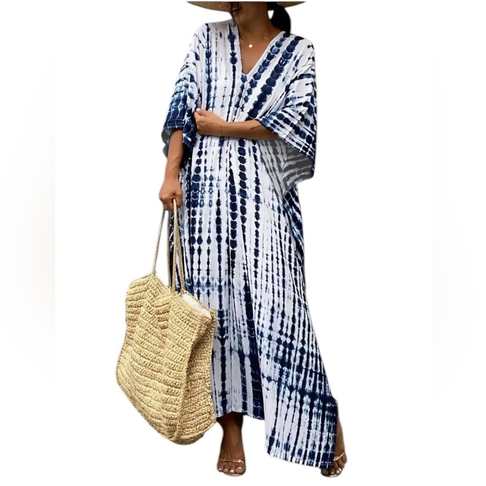 Vibrant Tie-Dye Print Long Sleeve Dress with Deep V-Neck & Batwing Sleeves, Loose Fit Turkish Kaftan for Spring, Summer, and Fall, Lightweight Woven Fabric for Casual Outings or Vacation Styling