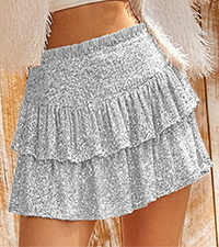 | design | Shirred elastic high waist, stretchy smocked waistband, tiered ruffled layers, two-tiers of ruffles, flared flowy, fashion pleated hem, solid color, mini Length. |