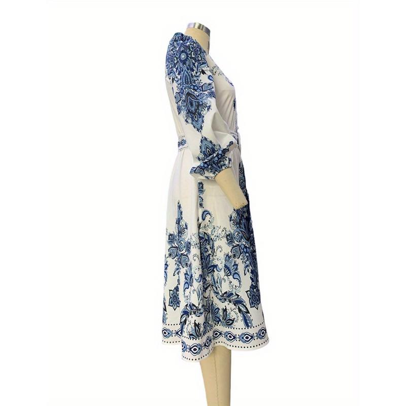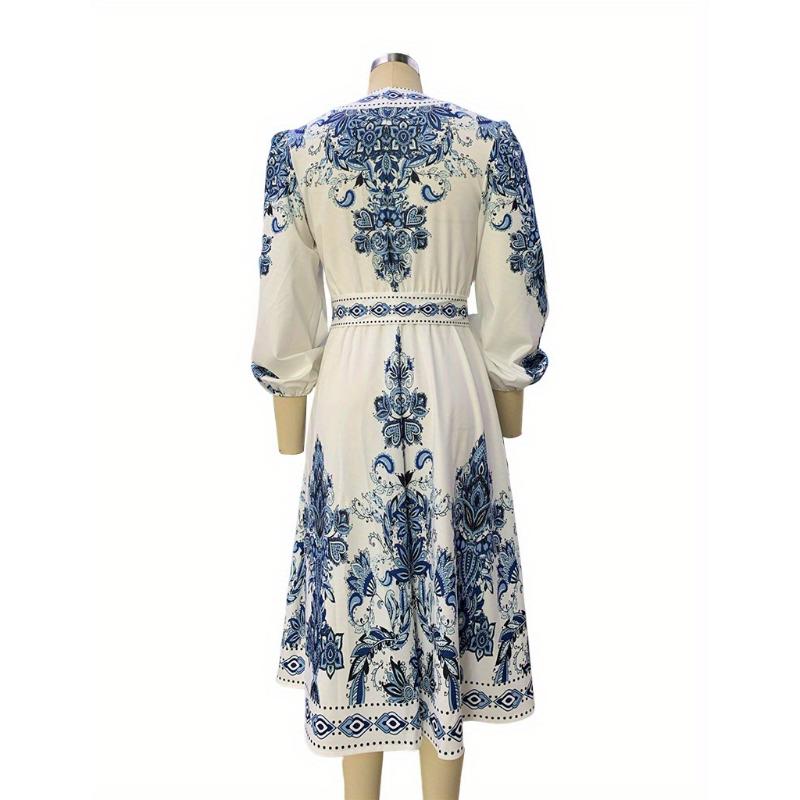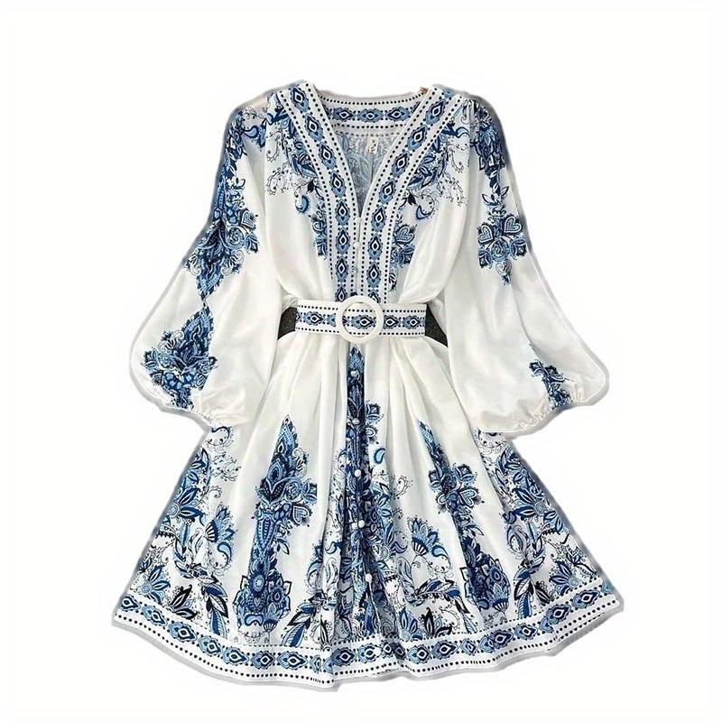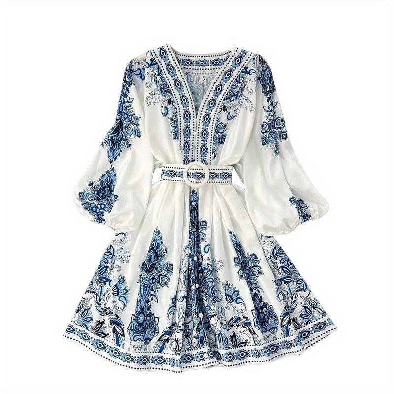 Women's Elegant V-Neck Long Sleeve Bohemian Print Dress - Comfortable and Versatile for Any Occasion