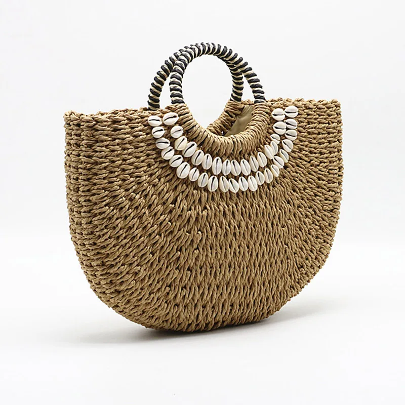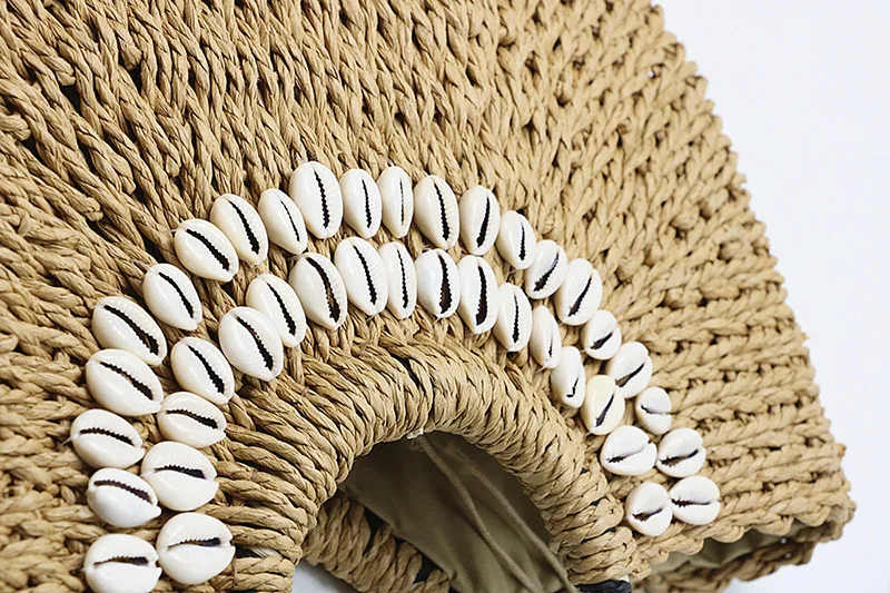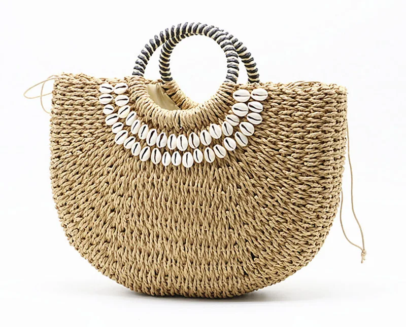 Women's Handbag Handmade Drawstring Straw Bag Summer Woven Shell Large Capacity Beach Bag Bohemia Female Knitted Top-Handle Tote